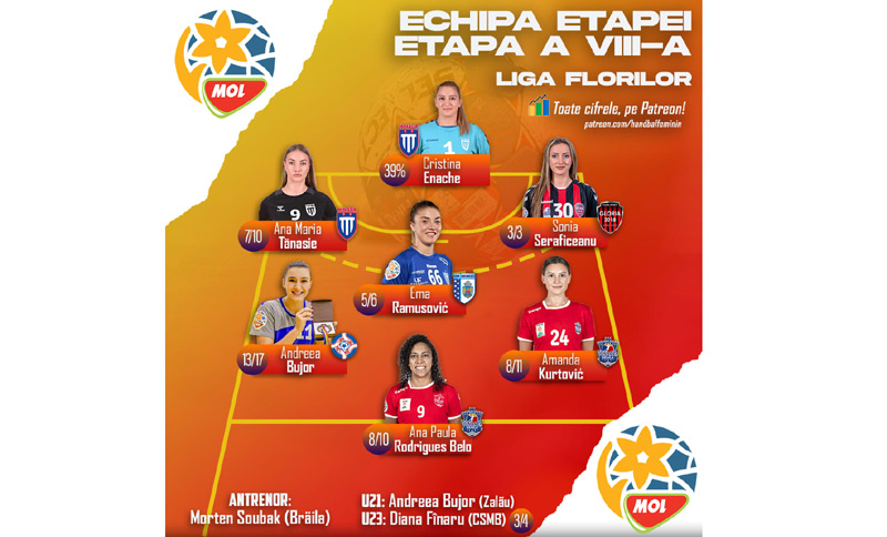 A fost alcătuită echipa ideală a Ligii Florilor pentru etapa a 8-a, a turului acestei competiții, rundă în care HC Dunărea a câștigat la scor, 29-21, la SCM Gloria Buzău. Victoria, precum și maniera în care a fost obținută, a propulsat în echipa etapei două handbaliste de la HC Dunărea. Iar artizanul acestui succes, Morten Soubak, a fost declarat antrenorul etapei.