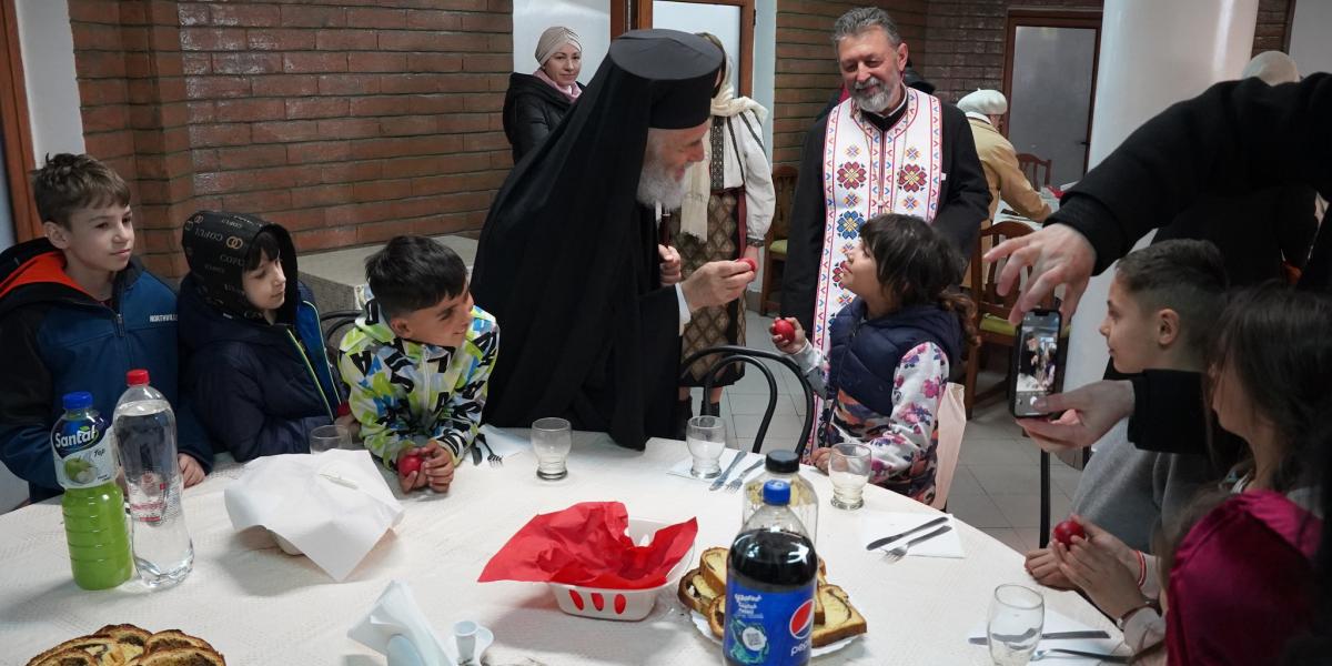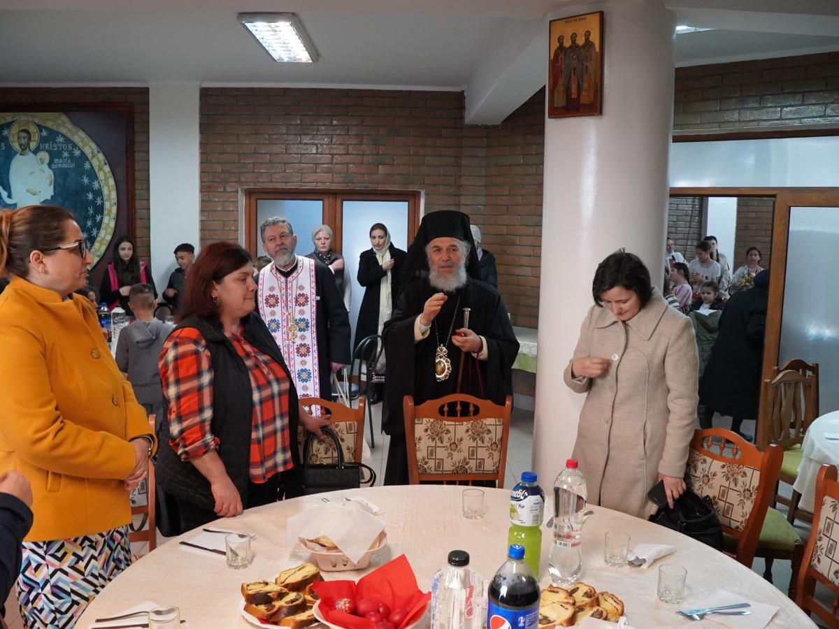 Părintele Arhiepiscop a binecuvântat apoi tradiționalele ofrande pascale și masa pregătită pentru copii și nevoiași la cantina din cadrul Așezământului social-filantropic al parohiei. Zilnic, aici primesc hrană caldă aproximativ 200 de persoane, prin strădania preoților și a credincioșilor.