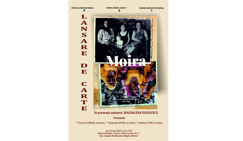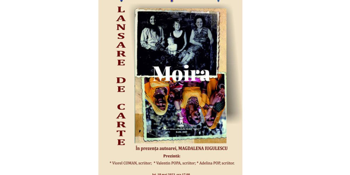 Joi, 18 mai 2023, de la ora 17.00, la sediul central al Muzeului Brăilei „Carol I”, din Piața Traian nr. 3 - Sala „Regele Ferdinand I și Regina Maria” - are loc lansarea volumului „Moira”, de dr. Magdalena Iugulescu, apărut, anul acesta, la Editura „Istros” a muzeului brăilean. Prezintă: Adelina Pop, scriitor; dr. Viorel Mortu, critic literar, scriitor; dr. Valentin Popa, scriitor.