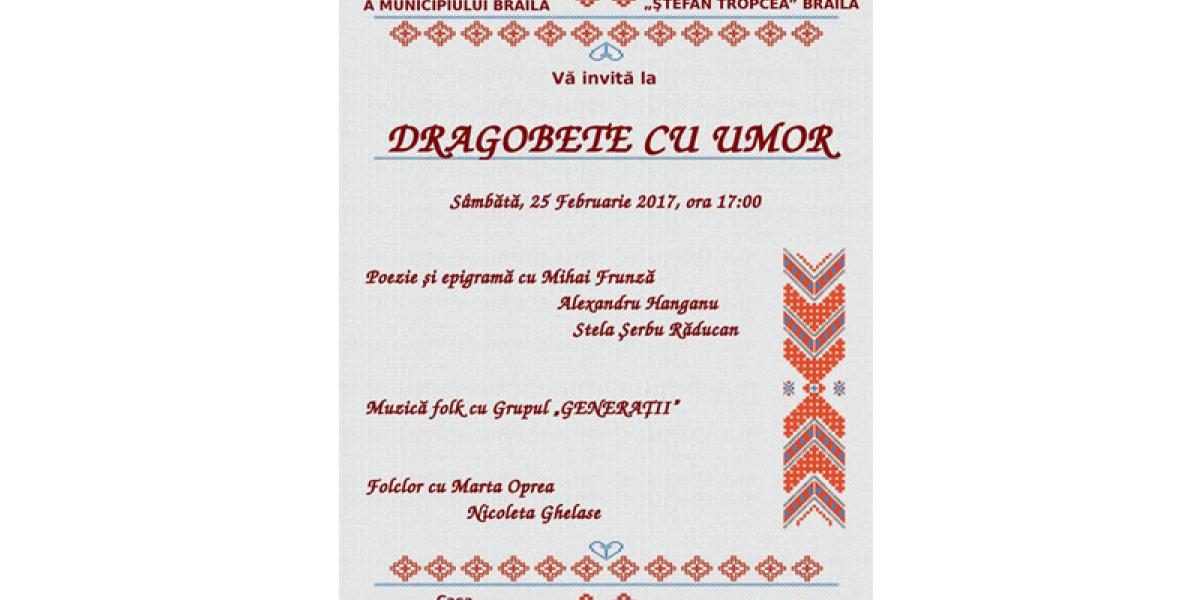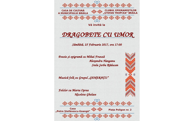 Sâmbătă, 25 februarie 2017, începând cu ora 17:00, Casa de Cultură a Municipiului Brăila şi Clubul Epigramiştilor Brăileni Ştefan Tropcea organizează Dragobete cu umor, o modalitate inedită de sărbătorire a iubirii la români. Evenimentul se va desfăşura la sediul Casei de Cultură din Piaţa Poligon nr. 2A, Casa Memorială Petre Ştefănescu-Goangă.