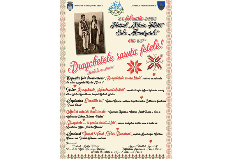 Primăria Municipiului Brăila organizează sămbătă, 24 februarie 2018, începând cu ora 15.00, la Teatrul “Maria Filotti”, evenimentul “Dragobetele sărută fetele!”.