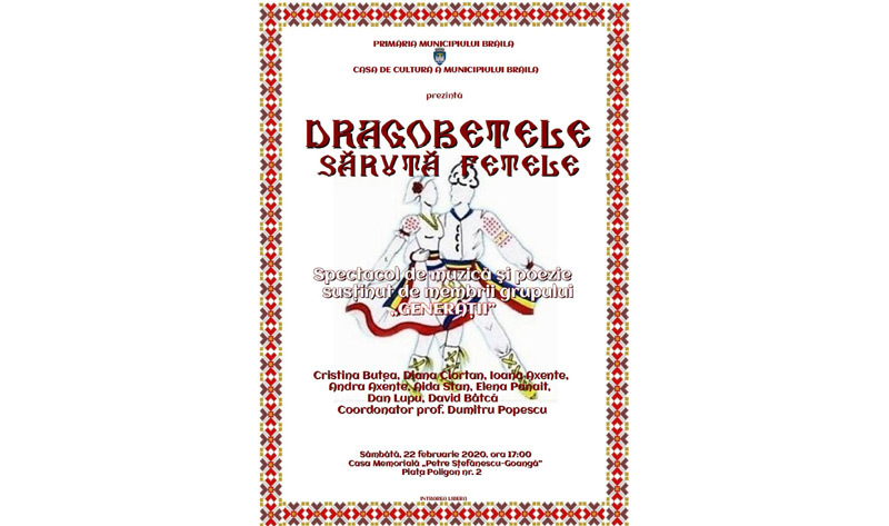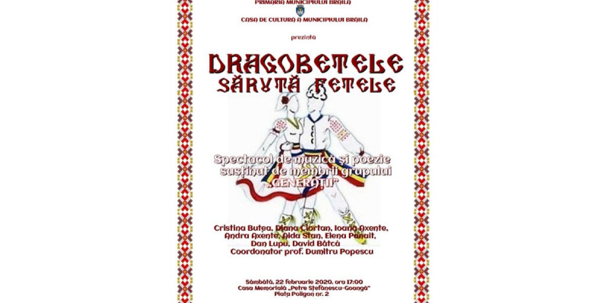 În aşteptarea Dragobetelui, sâmbătă, 22 februarie 2020, la Casa Memorială Petre Ştefănescu-Goangă, începând cu ora 17.00, va avea loc un spectacol de muzică şi poezie din creaţia populară susţinut de o parte dintre membrii Grupului Generaţii, coordonat de profesorul Dumitru Popescu. Este vorba despre: Diana Ciortan, Cristina Buţea, Andra Axente, Ioana Axente, Aida Stan, Elena Panait, Dan Lupu, David Bâtcă.