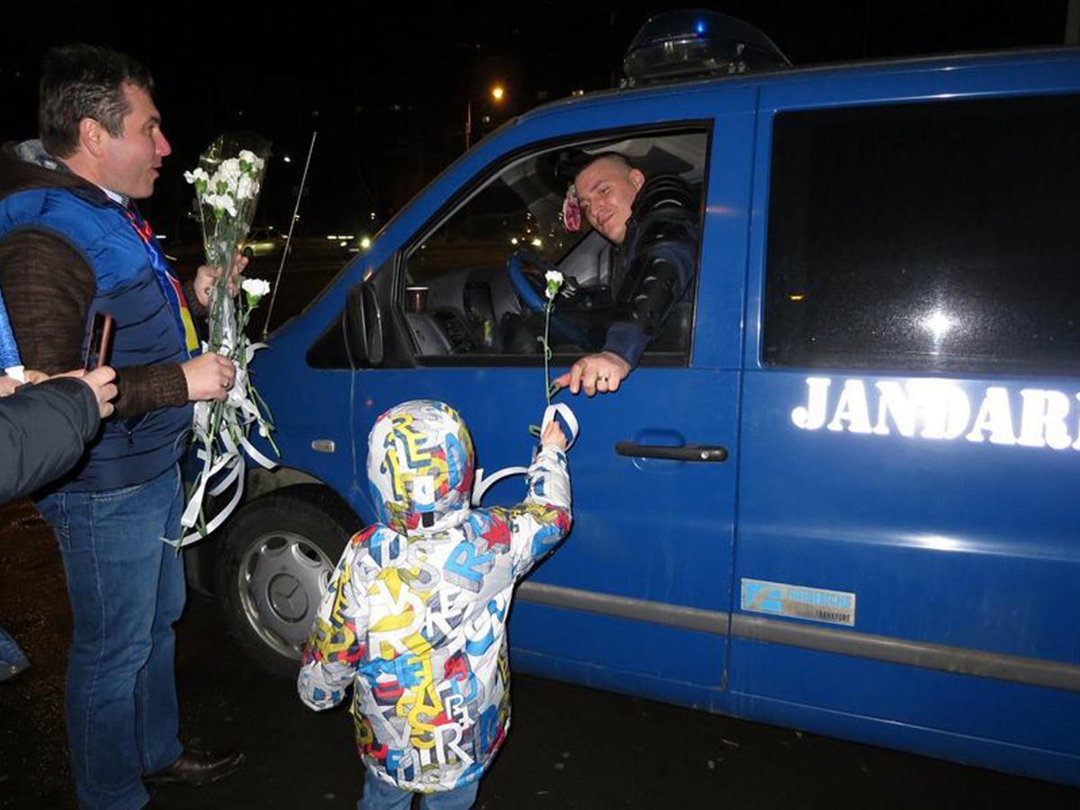 Încă de la primele minute ale protestului de vineri seară, manifestanţii au avut o atitudine prietenoasă faţă de jandarmi, astfel că un grup de copii i-au vizitat la dubele din care supravegheau protestul, pentru a le oferi flori.
