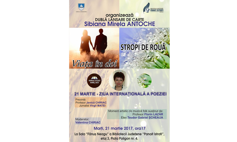 Marţi, 21 martie, ora 17.00, la Biblioteca Judeţeană „Panait Istrati” Brăila, sala “Fănuş Neagu” va avea loc lansarea cărţilor „Viaţa în doi” şi „Stropi de rouă”, semnate de Sibiana Mirela Antoche. Volumele de poezii sunt prezentate de prof. Jenică Chiriac şi jurnalistul Virgil Matei, iar evenimentul este moderat de Valentina Chiriac, şef birou în cadrul Bibliotecii. Dubla lansare de carte va fi presărată cu momente artistice de muzică folk susţinute de profesorul Florin Lazăr şi de elevul Teodor Gabriel Şcheaua.
