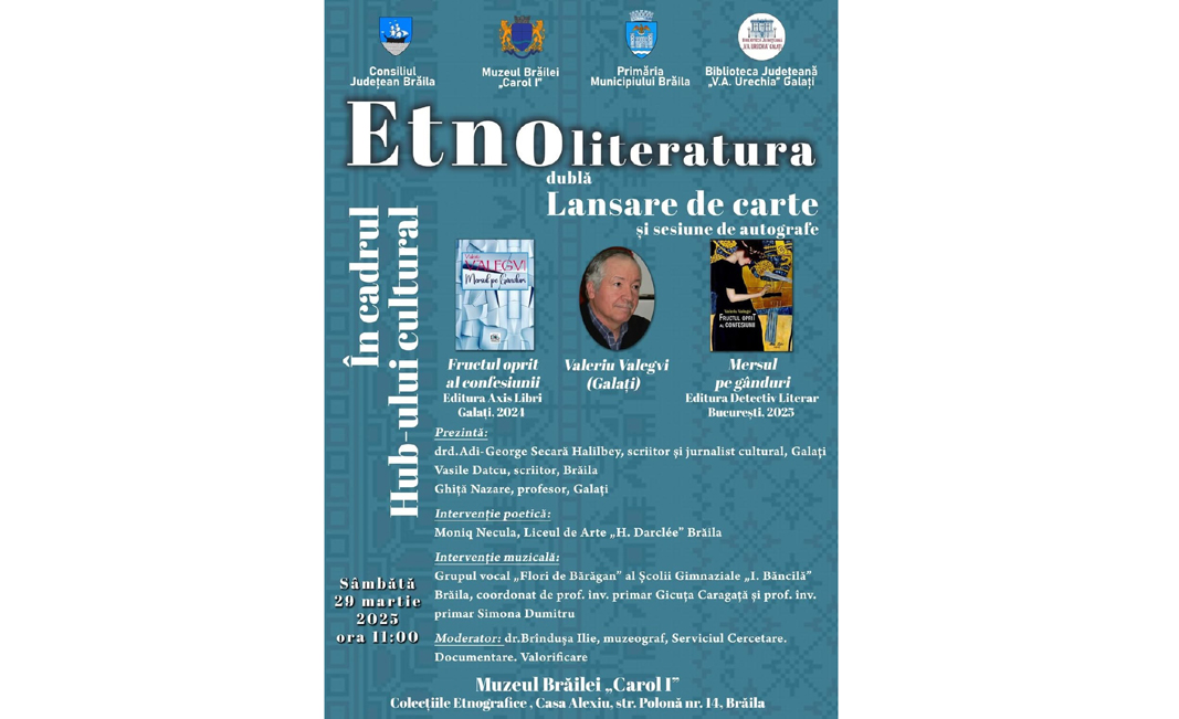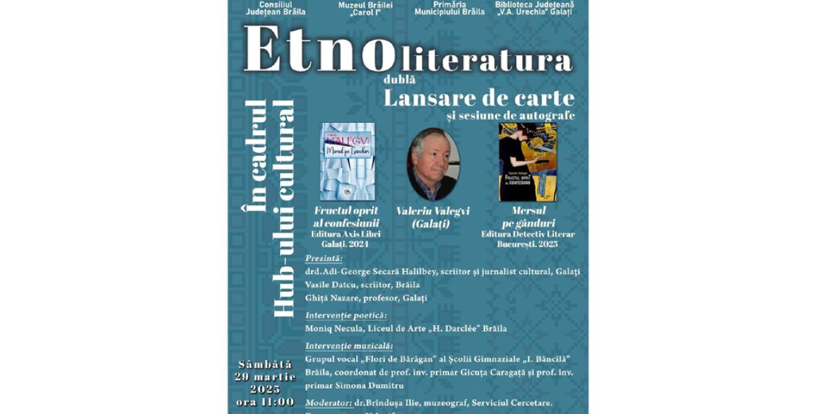 Muzeul Brăilei „Carol I” - Colecțiile Etnografice, în parteneriat cu Biblioteca Județeană „V. A. Urechia” Galați, organizează sâmbătă, 29 martie, începând cu ora 11:00, o dublă lansare de carte și o sesiune de autografe în cadrul Hub-ului cultural „Etnoliteratura”, la Casa Alexiu, din Strada Polonă nr. 14. Publicul brăilean este invitat la lansarea volumelor „Fructul oprit al confesiunii”, apărut la Editura Axis Libri Galați, în anul 2024, și „Mersul pe gânduri”, apărut la Editura Detectiv Literar București, în 2025, autor Valeriu Valegvi.