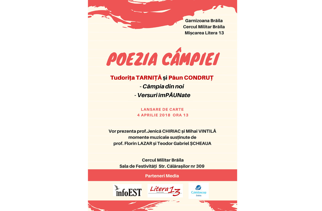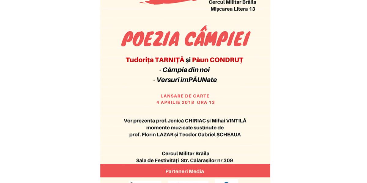 Miercuri, 4 aprilie 2018, de la ora 13.00, în sala de festivităţi a Cercului Militar Brăila va avea loc o dublă lansare de carte sub titlul “Poezia Câmpiei”. Jurnalista Tudoriţa Tarniţă lansează volumul de poezie “Câmpia din noi”, iar epigramistul Păun Condruţ un volum de “Versuri îmPĂUNate”. Ambele cărţi au apărut la editura InfoEST Siliştea, judeţul Brăila.