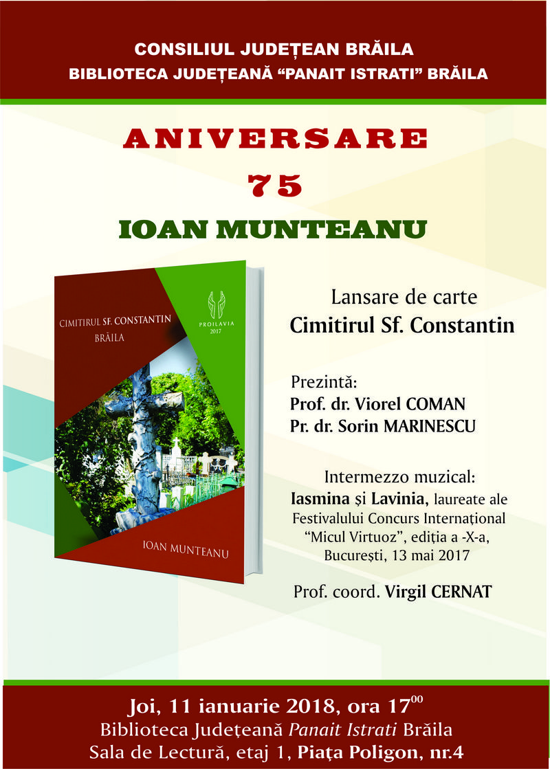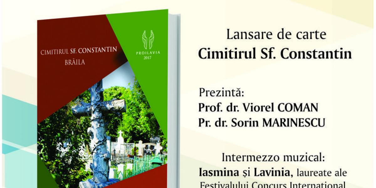 Joi, 11 ianuarie 2018, ora 17.00, la Sala de lectură a Bibliotecii Județeane „Panait Istrati” va avea loc lansarea cărții „Cimitirul Sf. Constantin Brăila”, semnată de prof. Ioan Munteanu. Cartea, apărută la Editura „Proilavia” din Brăila în anul 2017, conține un scurt istoric și o descriere a cimitirului brăilean, epitafuri și cugetări despre moarte. Începând cu actul de naștere din 1870 și până în zilele noastre, Cimitirul „Sf. Constantin” reprezintă o adevărată pagină de istorie a urbei. Parcurgând cartea putem afla istoria și genealogiile celor care și-au găsit odihna veșnică în acest spațiu, oameni care pe parcursul vieții au contribuit la evoluția economică, socială și culturală a Brăilei.