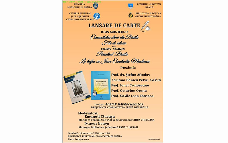 Astfel, sâmbătă, 10 ianuarie 2026, ora 11:00, la sediul Bibliotecii Județene „Panait Istrati” Brăila, va avea loc lansarea volumului „Comunitatea Elenă din Brăila. File de istorie”, de prof. Ioan Munteanu, precum și lansarea volumului „Povestind Brăila. La taifas cu Ioan Constantin Munteanu”, autor prof. dr. Viorel Coman.