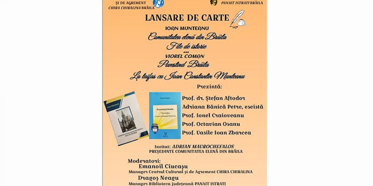 • este vorba de volumul „Comunitatea Elenă din Brăila. File de istorie”, de Ioan Munteanu, și volumul „Povestind Brăila. La taifas cu Ioan Constantin Munteanu”, de Viorel Coman • evenimentul va avea loc sâmbătă, 10 ianuarie 2026, la Biblioteca Județeană „Panait Istrati”