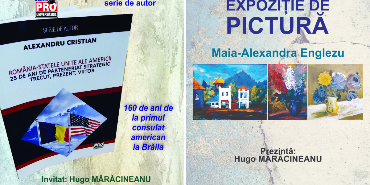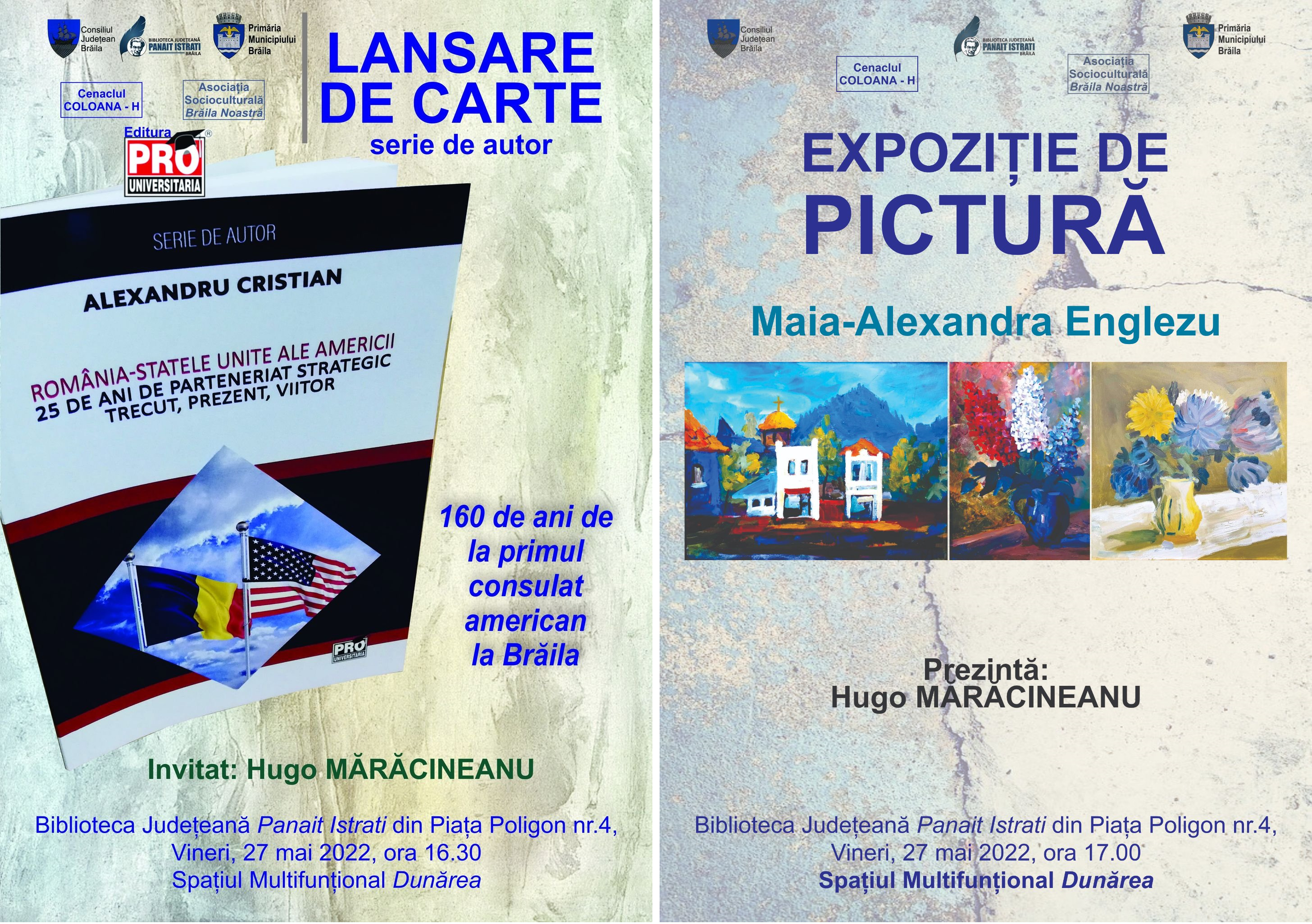 Brăilenii sunt invitaţi vineri, 27 mai, la două evenimente găzduite de Biblioteca Judeţeană „Panait Istrati”. De la ora 16.30, în spațiul Multifuncțional “Dunărea”, situat în parcul din curtea instituției, are loc evenimentul de lansare a cărții “România - Statele Unite ale Americii. 25 de ani de parteneriat strategic. Trecut, prezent, viitor”, semnată Alexandru Cristian. Alături de autor, la Biblioteca Județeană “Panait Istrati” Brăila va fi artistul plastic Hugo Mărăcineanu.