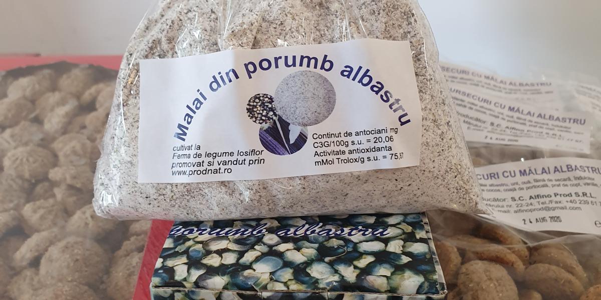 ”Clienţii se întreabă, de obicei, dacă porumbul este natural. Soiul nu este modificat genetic”, a explicat Mihaela Dumitru, directoare a ALFINO PROD. Această varietate de porumb provine din America Latină, dar este aclimatizată şi cultivată şi în judeţul Brăila, în comuna Tichileşti, de către Nicu Bogdan. În România, doar doi producători mai cultivă porumb albastru. Coloritul său este dat de conţinutul ridicat de antociani, stabili la tratamentele termice, ceea ce determină o activitate antioxidantă ridicată şi efecte antiinflamatorii. Printre avantajele mălaiului obţinut din porumb albastru se numără şi conţinutul redus de glucide, cantitatea cantitatea de fibre, dublă faţă de aceea a unui mălai obişnuit.
