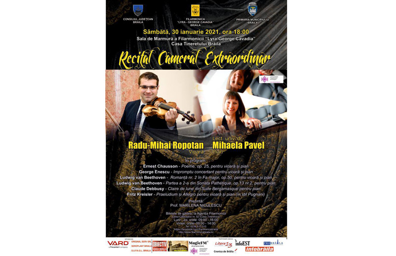 Filarmonica "Lyra-George Cavadia" Brăila, filarmonică ce se află sub autoritatea Consiliului Județean Brăila, organizează în sala de concert un Duo concertistic de excepție: Radu–Mihai Ropotan – vioară și Mihaela Pavel –pian, în ziua de 30.01.2021, de la ora 18.00 la Sala de Marmură a instituției din Calea Călărașilor nr.52 - Casa Tineretului.