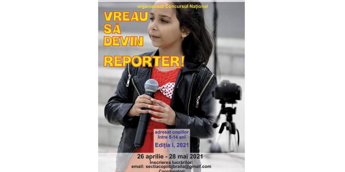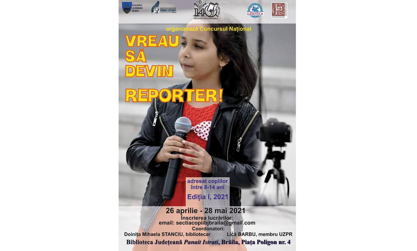 Biblioteca Județeană ”Panait Istrati” Brăila, ”Secția de Împrumut pentru copii. Ludotecă”, în colaborare cu Asociația Culturală „Leviathan”, vă invită la o nouă provocare: Concursul Național ”Vreau să devin reporter”. Concursul este adresat copiilor și numai copiilor, fiind împărțit pe două secțiuni: 8-10 ani și 11-14 ani.