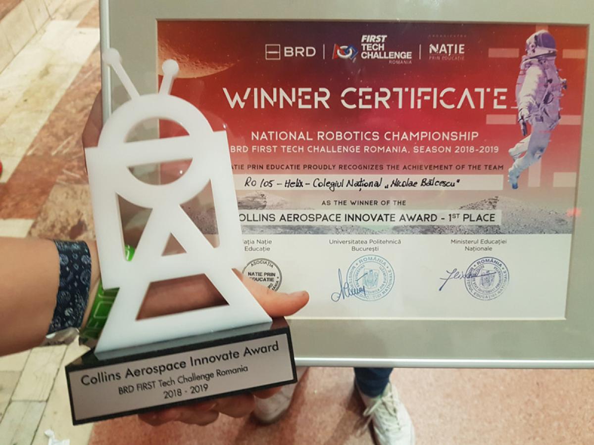 • elevii şi mentorii care au lucrat de zor în cadrul Clubului de Robotică de la Biblioteca Judeţeană “Panait Istrati” au câştigat premiul “Collins Aerospace Innovate Award!” • echipa s-a clasat pe locul 8 la nivel naţional • acum, că au simţit gustul victoriei, membrii “Helix” visează ca anul viitor să participe din nou la această competiţie şi să urce în clasament