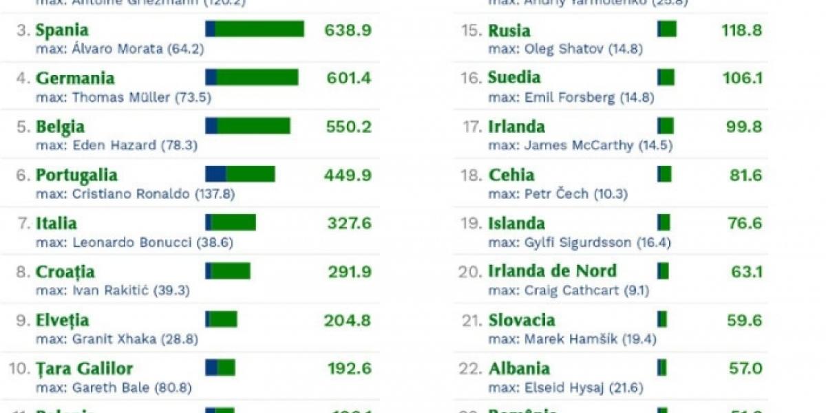 Naționala țării noastre se află la celălalt capăt al clasamentului. Cu o valoare însumată de 51,3 milioane de euro, românii ocupă poziția a 23-a. Ungaria ocupă ultimul loc, cu 30,1 milioane de euro, iar înaintea României este Albania, cotată la 57 de milioane. Elveția - cealaltă echipă din Grupa A, din care fac parte România, Franța și Albania - se află pe locul 9 (204,8 milioane de euro).