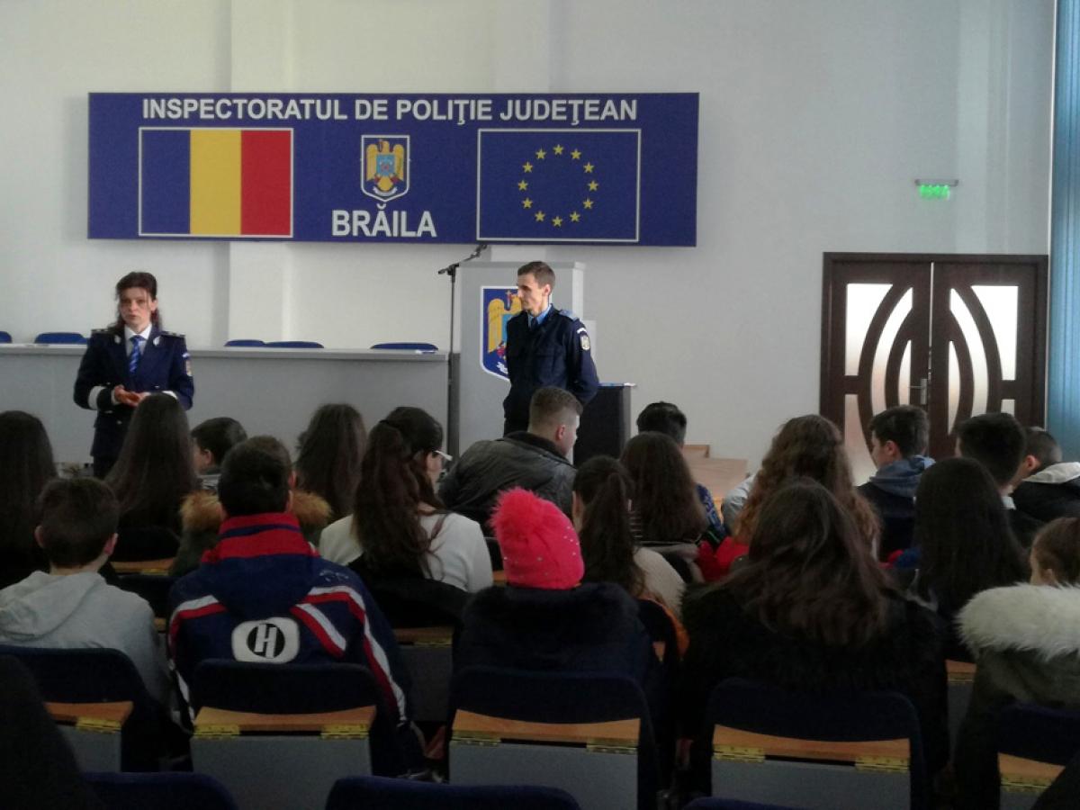 În această săptămână, poliţişti ai Inspectoratului de Poliţie Judeţean Brăila, jandarmi ai Inspectoratului de Jandarmi Judeţean Brăila, ofiţeri ai Serviciului Judeţean Anticorupţie Brăila şi specialişti ai Agenţiei Naţionale Împotriva Traficului de Persoane - Centrul Regional Galaţi şi-au unit forţele pentru a aduce o informare completă şi corectă, structurată pe teme de interes pentru elevii brăileni. Prima zi a săptămânii de educaţie juridică a debutat cu întâlniri ale poliţiştilor şi jandarmilor cu elevii din municipiul Brăila, temele abordate fiind: “Faptele mele şi consecinţele acestora” şi “Familia şi familia extinsă. Violenţa în familie”.