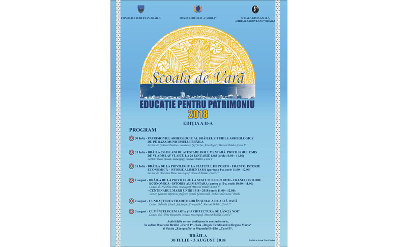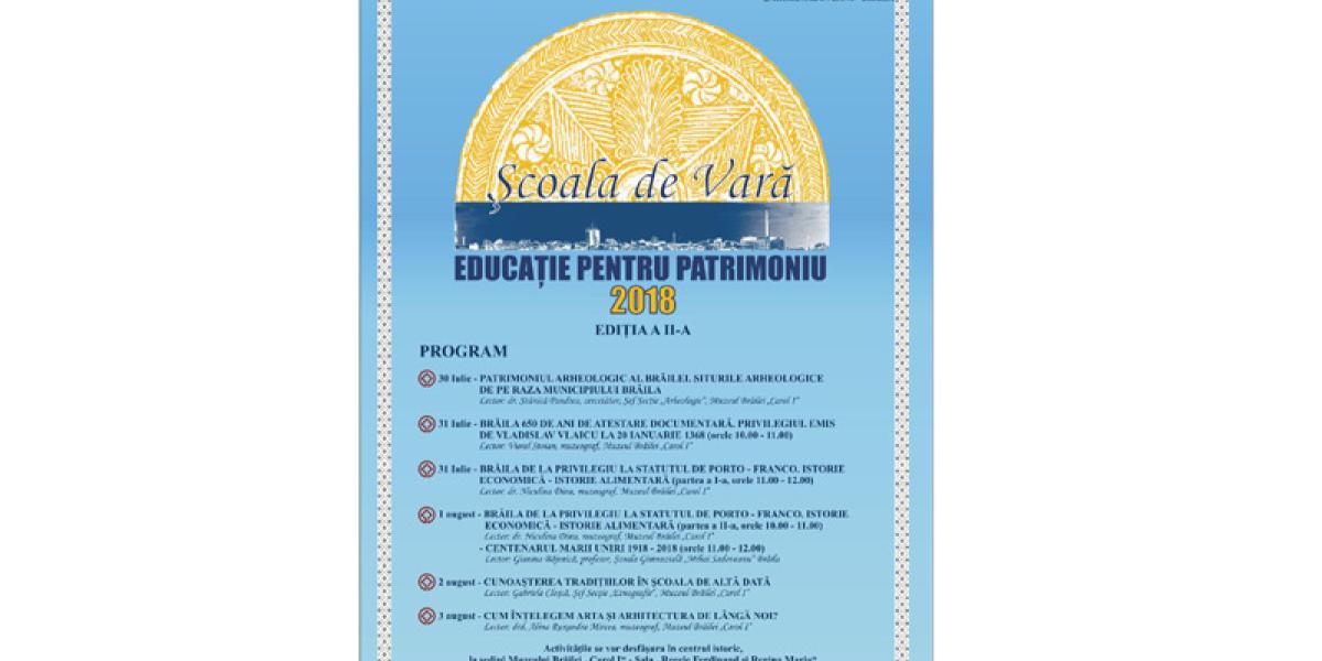 Luni, 30 iulie 2018, începând cu ora 10, la sediul Muzeului Brăilei “Carol I”, din Piaţa Traian, nr. 3, încep cursurile celei de a ll-a ediţii a Şcolii de Vară “Educaţie pentru Patrimoniu”. Activităţile din cadrul Şcolii de vară vor avea loc în perioada 30 iulie - 1 august şi pe 3 august, la sediul Muzeului Brăilei “Carol I” Sala “Regele Ferdinand şi Regina Maria”, iar cele din data de 2 august, la Secţia “Etnografie”, pe strada Polonă, nr. 14, în intervalul orar: 10.00 - 12.00.