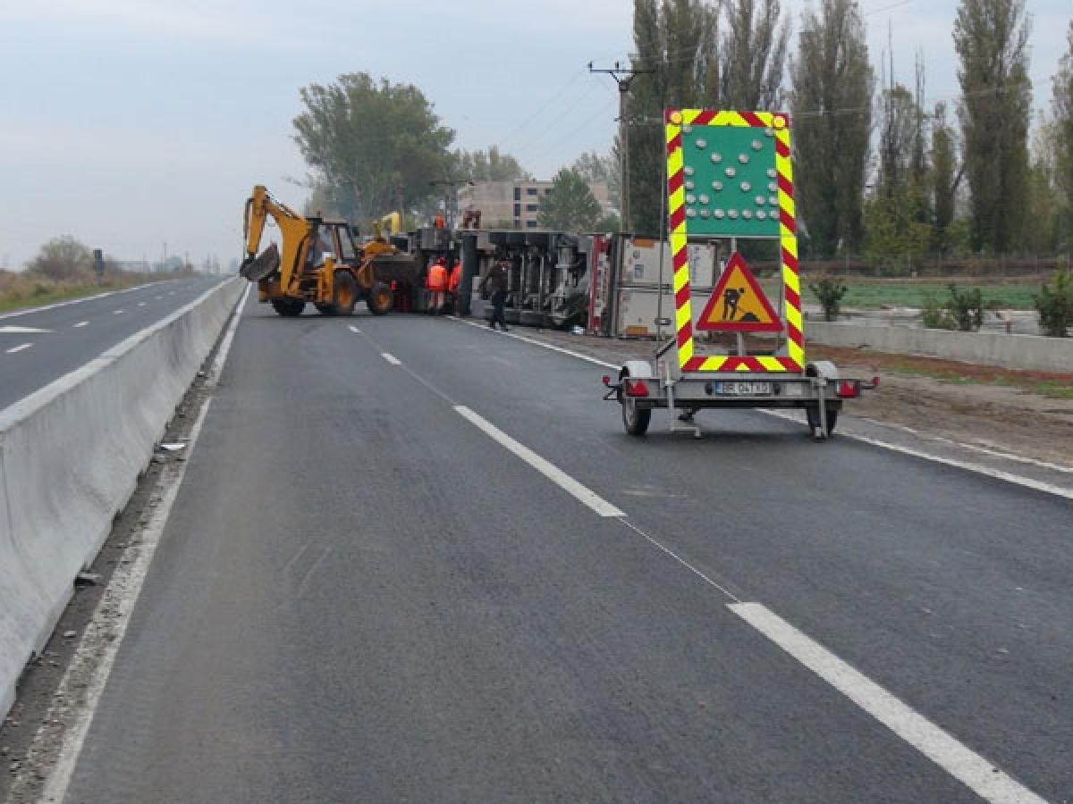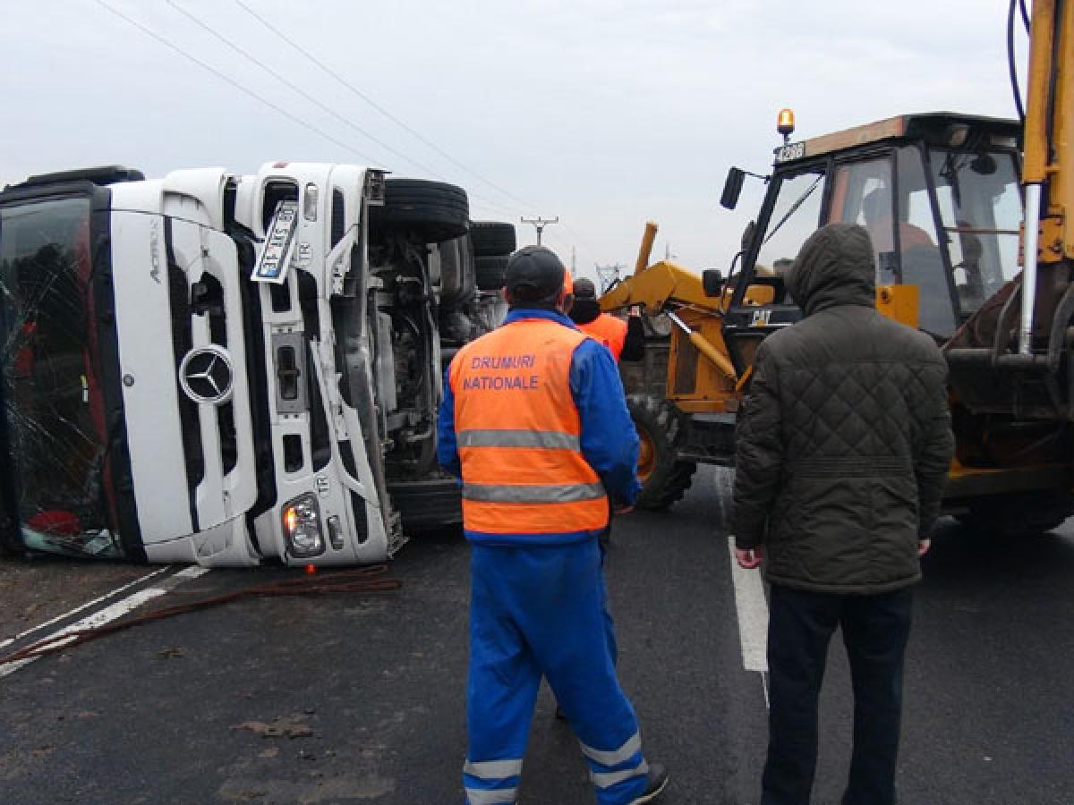 Evenimentul rutier s-a produs joi dimineaţă, în jurul orei 5.00, şoferul TIR-ului turcesc deplasându-se de la Slobozia spre Ucraina. El a susţinut că nu a observat începutul zonei cu separatoare şi de aceea s-a urcat pe ele. Tir-ul cu castraveţi a blocat o bandă de sens mai multe ore şi abia în jurul orei 8.30 angajaţii de la drumuri naţionale au reuşit să scoată mastodontul în afara părţii carosabile. În urma evenimentului, şoferul a ajuns la Spital cu leziuni uşoare.