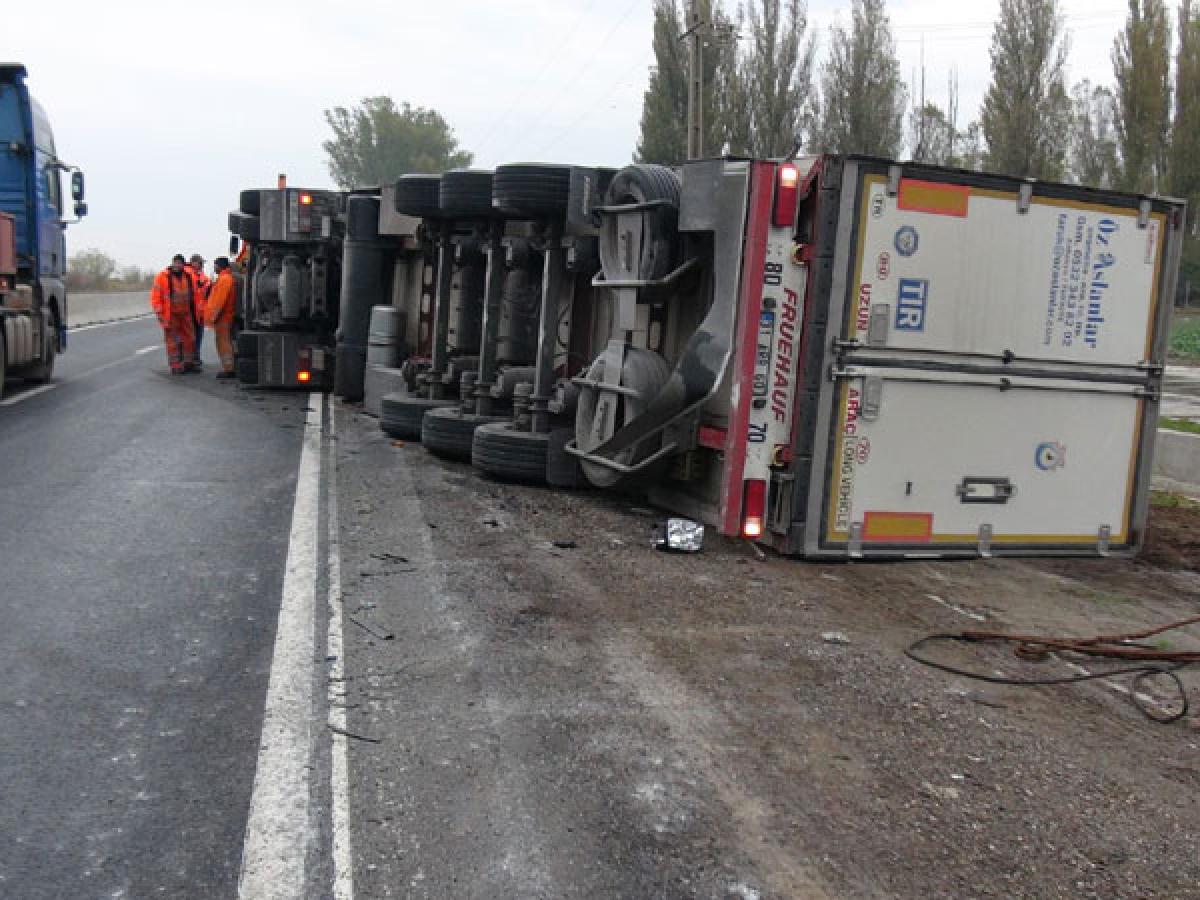 Un nou incident cu urmări dramatice s-a produs în trafic, joi dimineaţă, pe DE 584 (Brăila – Slobozia), în zona unde au fost montate deja celebrele separatoare de sens. Şoferul turc al unui TIR plin cu castraveţi a intrat direct în parapeţii de beton, a rulat mai bine de 40 de metri pe acestea, apoi s-a răsturnat pe partea dreaptă.