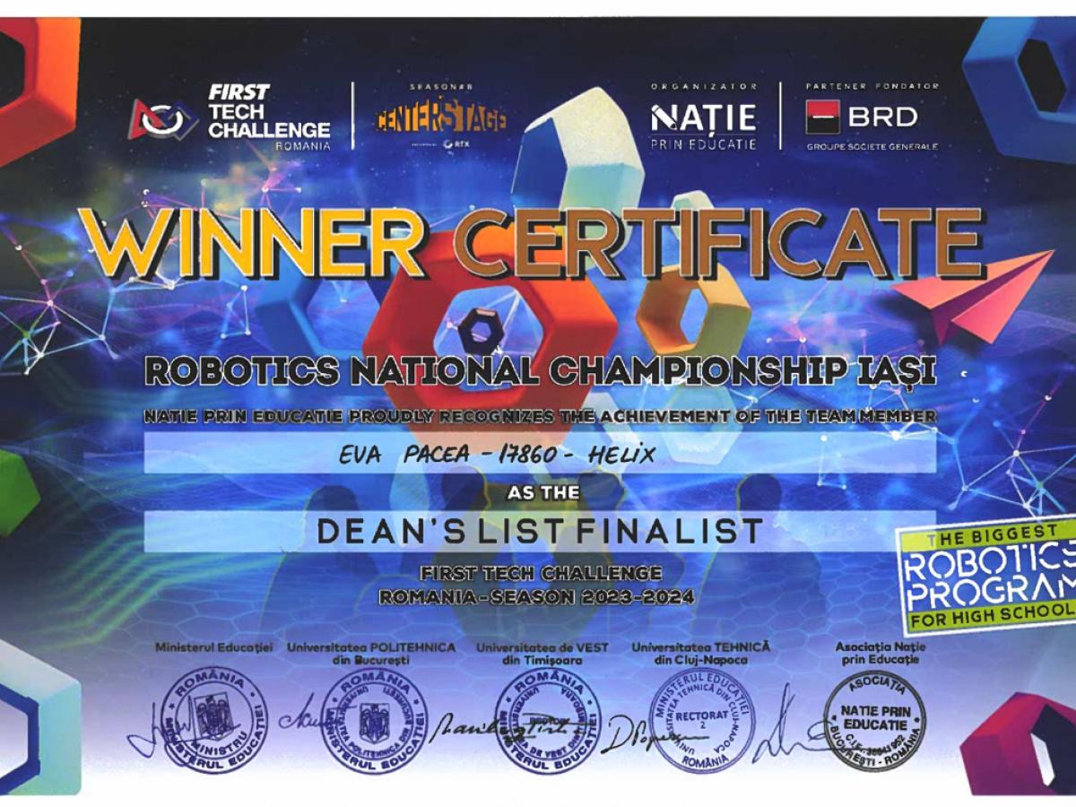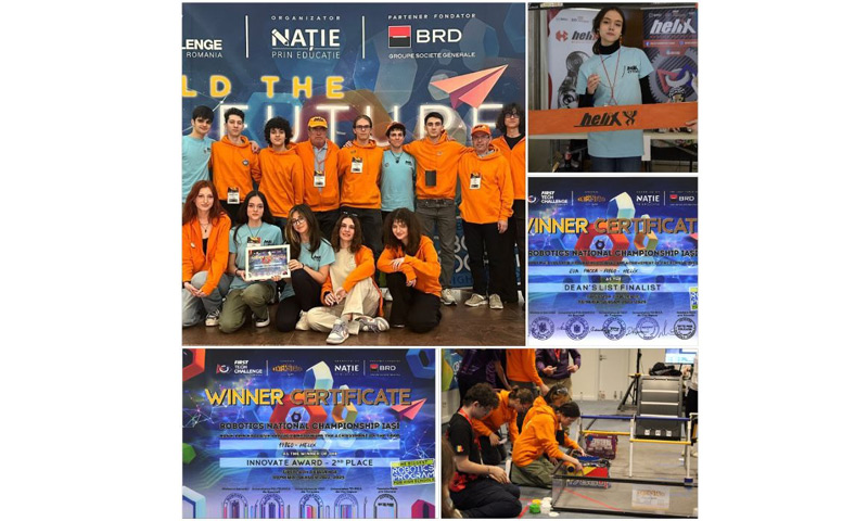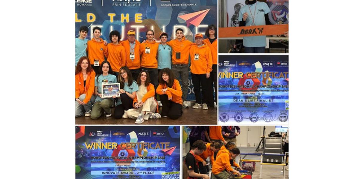 • totodată, echipa Helix Brăila a luat premiul 2 la ”Innovate Award” • premiile au fost obținute în urma campionatului național de robotică First Tech Challenge, desfășurat în perioada 22-24 martie, la Iași • Eva Mihaela Pacea, elevă în clasa a XI-a la Colegiul Național ”Nicolae Bălcescu”, a câștigat Premiului ”Dean’s List” și va reprezenta echipa ”Helix”, Brăila și România la campionatul mondial din aprilie, ce se va ține la Huston, Statele Unite • premiul ”Innovate Award” a fost obținut de echipa Bibliotecii Județene ”Panait Istrati” pentru ingeniozitatea și creativitatea de care au dat dovadă în cadrul competiției First Tech Challenge