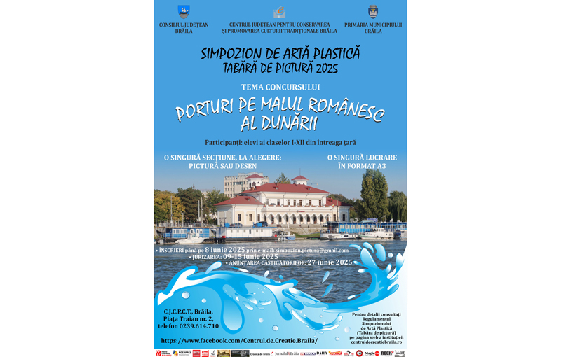 Consiliul Județean Brăila, prin Centrul Judeţean pentru Conservarea şi Promovarea Culturii Tradiţionale, și Primăria Municipiului Brăila organizează, în intervalul martie - iulie 2025, Simpozionul de Artă Plastică (Tabără de pictură), „un prilej pentru participanți de a-și demonstra măiestria, talentul și perseverența în a reuși, o invitație la comunicare doar prin culori, creioane și acuarele”.