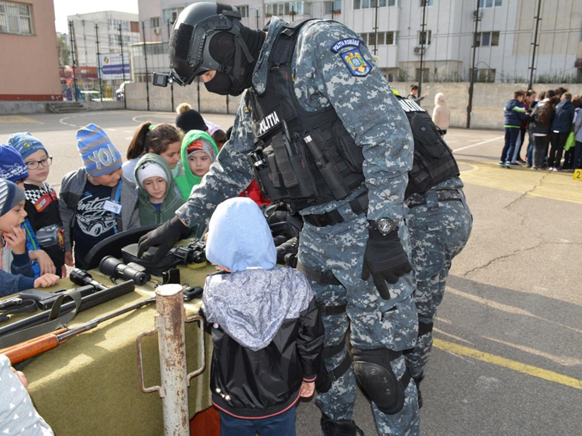 Prima zi a evenimentului care se derulează în această săptămână a fost dedicată prevenirii delincvenţei juvenile. Cadrele didactice şi elevii unităţii de învăţământ i-au primit cu interes pe oamenii legii, care le-au destăinuit din tainele meseriei de poliţist. În curtea instituţiei au fost amenajate ateliere de prezentare a autospecialelor, a tehnicii şi echipamentelor folosite în activităţile specifice de către specialiştii criminalişti, luptătorii de acţiuni speciale, poliţiştii rutieri şi agenţii de ordine publică. “Poliţiştii Serviciului Rutier le-au explicat rolul lor în prevenirea accidentelor rutiere şi dirijarea traficului, arătându-le copiilor autospeciala rutieră dotată cu radar şi etilotest. Specialistul Serviciului Criminalistic a prezentat copiilor principalele dotări ale laboratorului criminalistic, activitatea cea mai atractivă pentru aceştia dovedindu-se a fi amprentarea. De asemenea, luptătorii Serviciului pentru Acţiuni Speciale au prezentat o parte dintre dotările unui structuri de intervenţie, realizând o discuţie interactivă cu aceştia”, au arătat reprezentanţii Inspectoratului de Poliţie Judeţean Brăila.