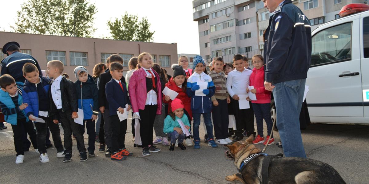 Întâlniri palpitante pentru elevii de la Şcoala Gimnazială “Fănuş Neagu”, în cadrul “Săptămânii Prevenirii Criminalităţii”. Ieri, cei mici au stat faţă în faţă cu “mascaţii”, dar şi cu poliţiştii criminalişti, cei de la rutier şi câinele poliţist “Vera”, care a prins un “infractor”, în direct. După ce au admirat cu atenţie spectacolul pus în scenă de oamenii legii, mulţi dintre elevi şi-au manifestat dorinţa de a deveni, pe viitor, poliţişti.