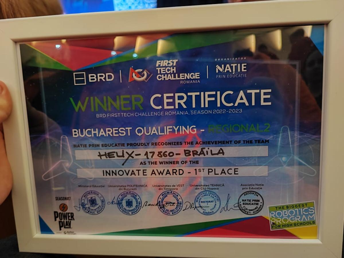 În perioada 17-19 februarie, la București, “Helix” a participat la etapa regională a concursului, câștigând premiul I la categoria “Innovate Award” (Inovație), locul 10 în clasamentul general și a obținut calificarea în finală. Premiul pentru inovație a fost oferit de juriul competiției pentru că robotul creat de elevii brăileni s-a diferențiat de cei realizați de competitori prin constucția mecanică, design și funcționalitate. La etapa regională au participat 91 de echipe de robotică din țară.