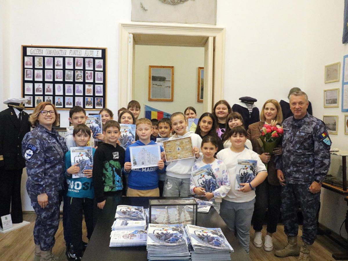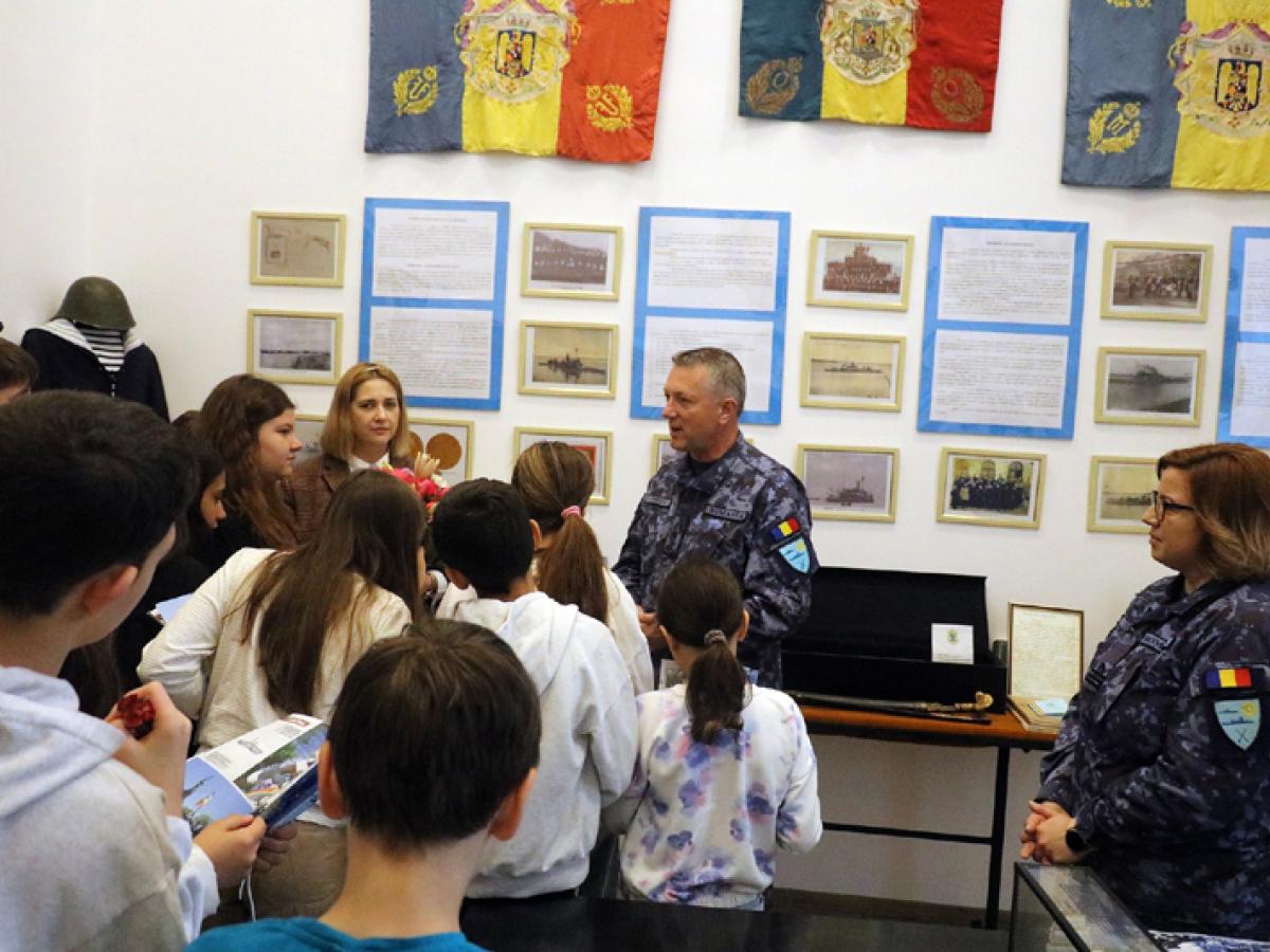 Elevi ai Colegiului Național „Ana Aslan” din Brăila, în vizită la Sala de Tradiții a Comandamentului Flotilei Fluviale „Mihail Kogălniceanu”.