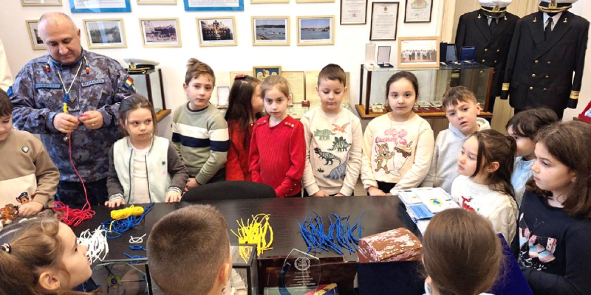 Elevii clasei I „Steluțele” de la Școala Gimnazială „Fănuș Neagu” Brăila, însoțiți de doamna învățătoare, au vizitat, miercuri, 17 decembrie, Sala de Tradiții a Comandamentului Flotilei Fluviale „Mihail Kogălniceanu”, de pe Strada Împăratul Traian. Cei mici au descoperit viața de marinar, au aflat povești interesante și au avut parte de surprize frumoase oferite de militarii marinari prezenți la Comandament. Elevii au admirat, totodată, exponatele din Sala de Tradiții a Comandamentului Flotilei Fluviale și au învățat să confecționeze brățări și noduri marinărești. A fost o experiență educativă și plină de emoție, trăită cu zâmbete și curiozitate.