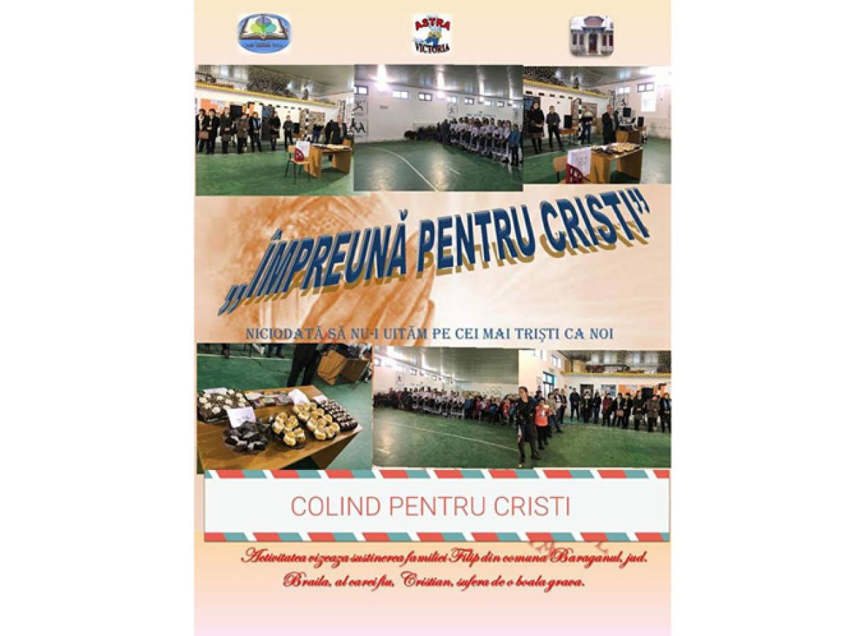 Şcoala Gimnazială Victoria, împreună cu structurile arondate - grădiniţa Victoria, Şcoala Mihai Bravu şi grădiniţa Mihai Bravu, sunt şi în acest an alături de Cristian Filip! La iniţiativa Consiliului Şcolar al Elevilor şi sub deviza “Să nu-i uităm niciodată pe cei mai trişti ca noi!”, copiii, profesorii şi părinţii au muncit cot la cot şi au realizat o frumoasă campanie umanitară pentru adolescent. Acţiunea a avut toate ingredientele unei campanii reuşite: spectacol caritabil, târg de prăjituri şi cei mai frumoşi colindători.