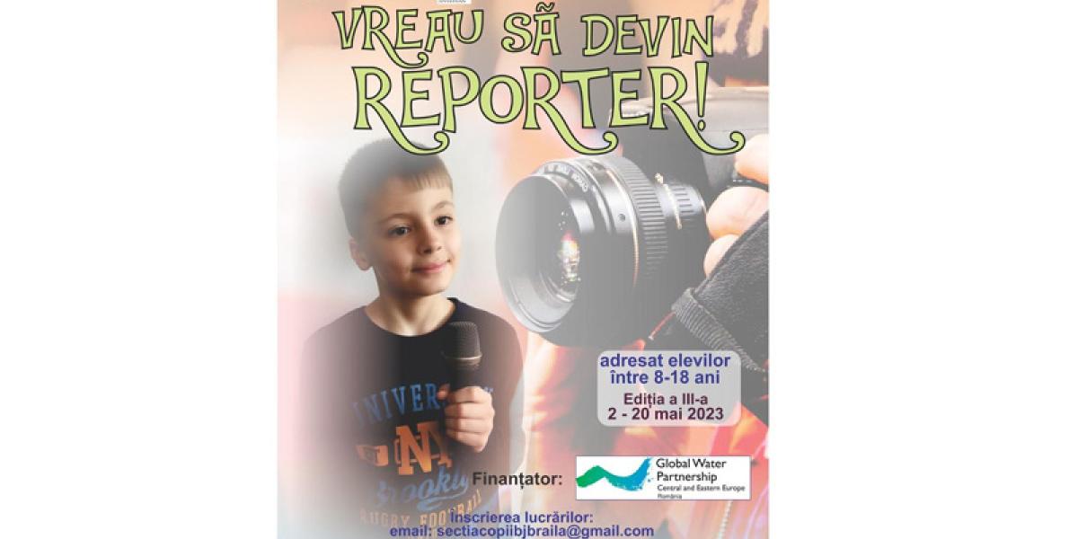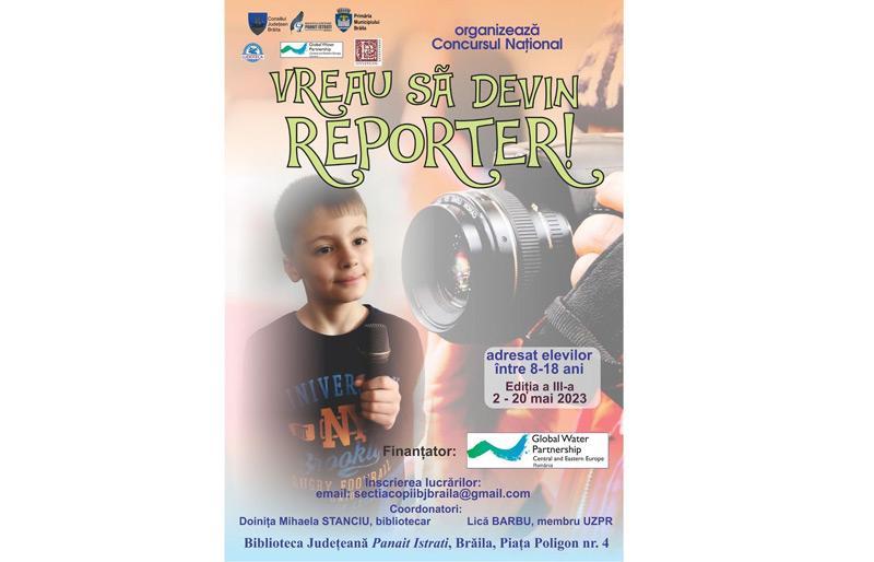 Biblioteca Județeană „Panait Istrati” Brăila, Secția de Împrumut pentru copii. Ludotecă, în colaborare cu Asociația Culturală “Leviathan” și cu Asociația ”Parteneriatul Global al Apei” vă invită la o nouă provocare: Concursul Național „Vreau să devin reporter!”. Concursul este adresat elevilor cu vârsta între 8–18 ani și cuprinde trei secțiuni: reportaje video, reportaje audio sau reportaje scrise.
