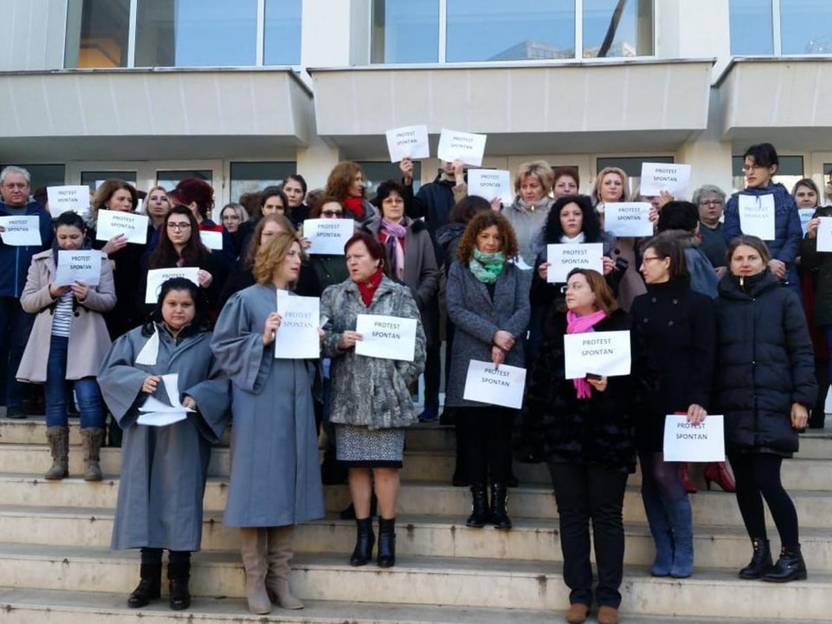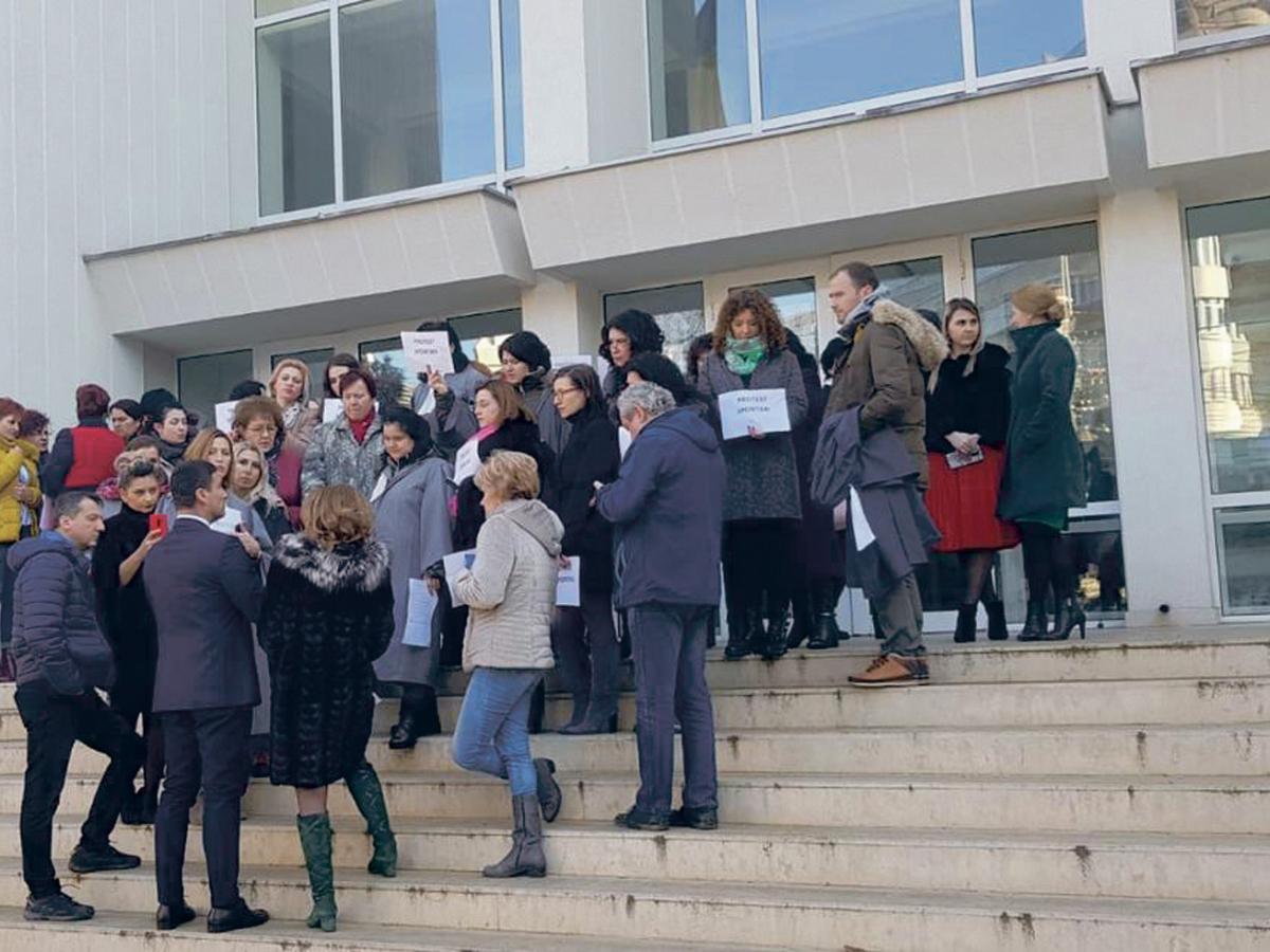 • ieri, aproximativ 50 de grefieri au protestat pe treptele Palatului de Justiţie Brăila • între orele 10.00 - 12.00, grefierii din toată ţara au ieşit în faţa instanţelor în semn de protest faţă de eliminarea pensiilor speciale şi ameninţă cu “blocarea totală” a activităţii dacă proiectul de lege va fi votat • prefectul Cătălin Boboc a mers la protestatarii din Brăila şi le-a ascultat nemulţumirile