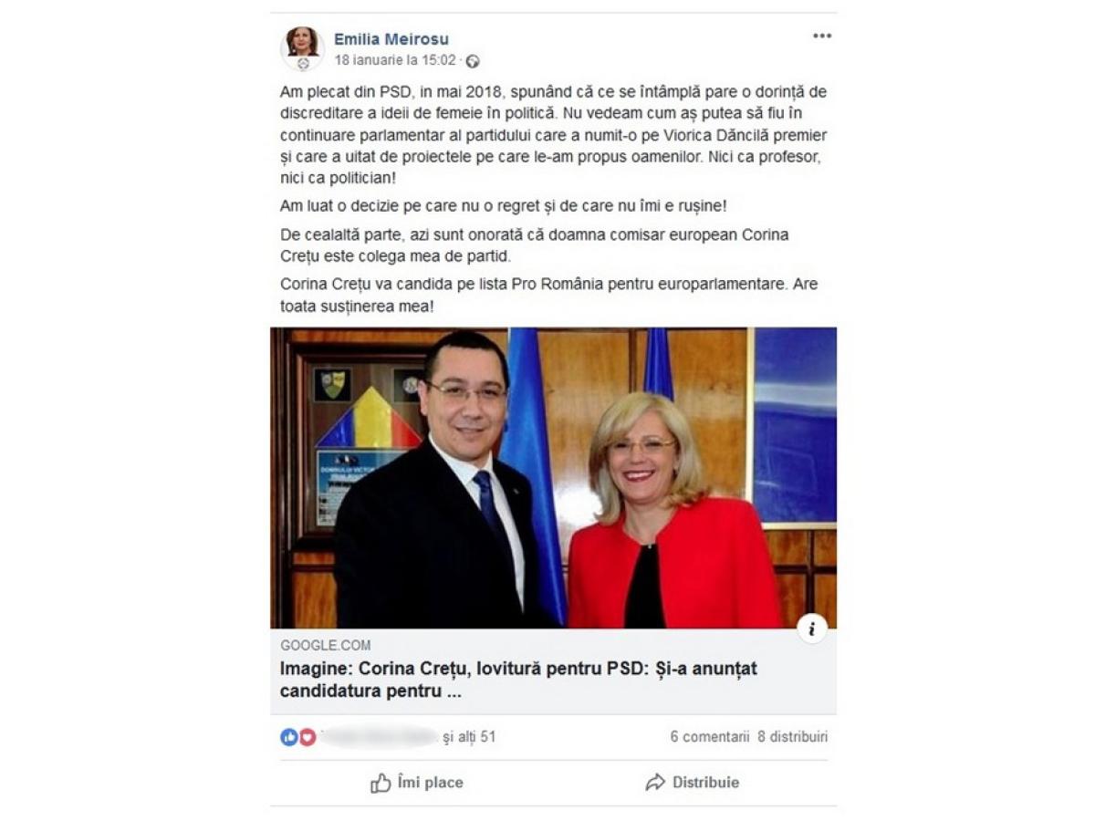 “Am plecat din PSD în mai 2018, spunând că ce se întâmplă pare o dorinţă de discreditare a ideii de femeie în politică. Nu vedeam cum aş putea să fiu în continuare parlamentar al partidului care a numit-o pe Viorica Dăncilă premier şi care a uitat de proiectele pe care le-am propus oamenilor. Nici ca profesor, nici ca politician! Am luat o decizie pe care nu o regret şi de care nu îmi e ruşine! De cealaltă parte, azi (n.r. - 18 ianuarie) sunt onorată că doamna comisar european Corina Creţu este colega mea de partid. Corina Creţu va candida pe lista Pro România pentru europarlamentare. Are toată susţinerea mea!”, a scris Meiroşu, alături de o fotografie în care apar Corina Creţu şi Victor Ponta.