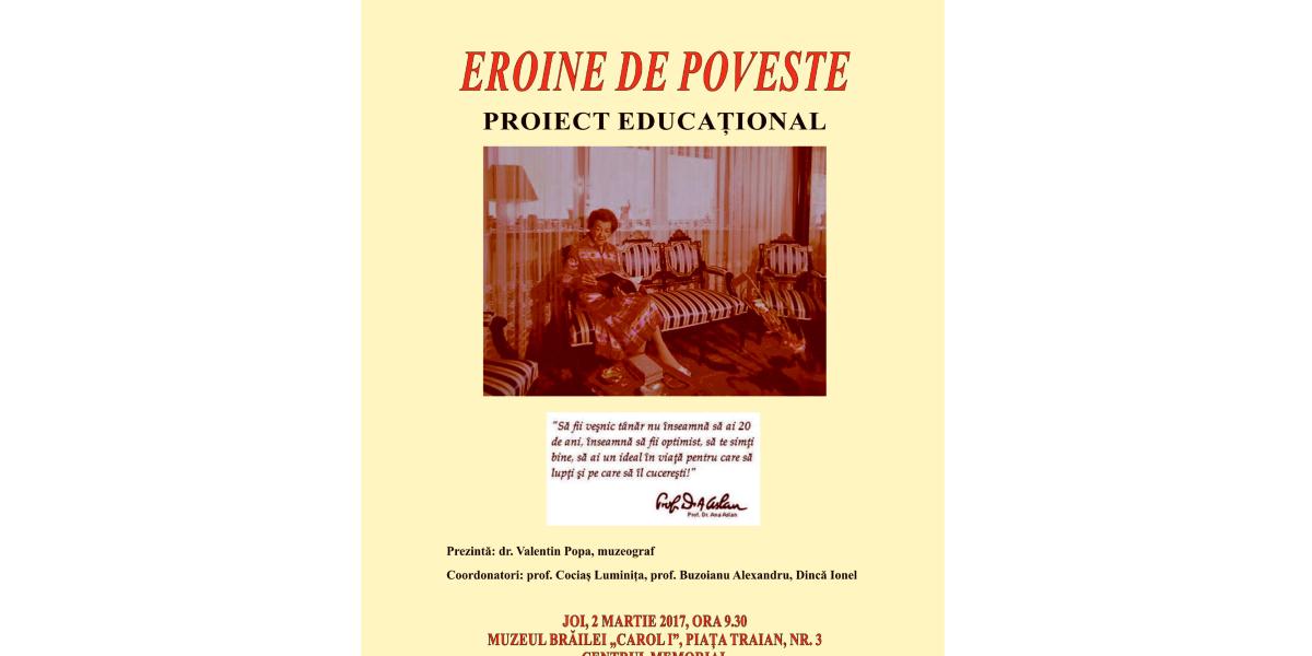 Muzeul Brăilei „Carol I” în colaborare cu Şcoala Gimnazială Specială Tichileşti organizează joi, 2 martie 2017, ora 9.30, la Centrul Memorial „Nae Ionescu, Vasile Băncilă, Anton Dumitriu, Ana Aslan, Edmond Nicolau, Valeriu Dinu” o activitate cu tema Eroine de poveste. Evenimentul este prezentat de dr. Valentin Popa, muzeograf şi coordonat de prof. Luminiţa Cociaş, prof. Alexandru Buzoianu şi Ionel Dincă.