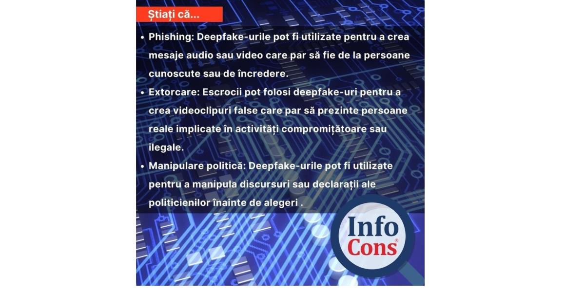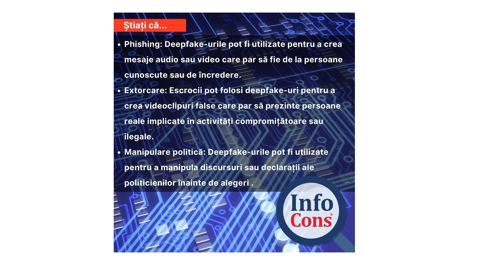 Escrocheriile deepfake reprezintă utilizarea tehnologiei deepfake în scopuri frauduloase sau de manipulare. Aceste escrocherii pot varia de la scheme complexe de fraudă financiară la atacuri asupra reputației sau vieții private a indivizilor, precizează InfoCons. Iată câteva exemple ale modurilor în care deepfake-urile pot fi utilizate în escrocherii: