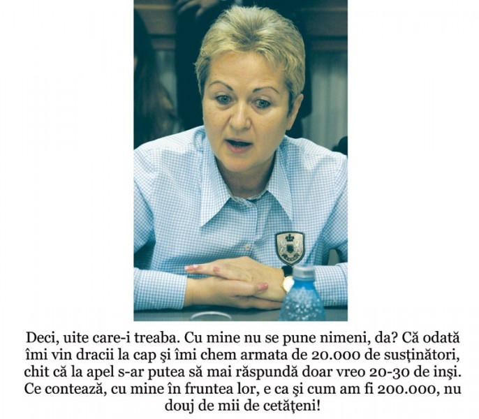 Nu cei 20.000 de brăileni care au votat-o şi care acum, cu siguranţă, s-au împuţinat dramatic, ci contează doar toanele şi hachiţele acestei doamne fostă independentă. Sunt momente când pur şi simplu bunul simţ te îndeamnă să nu faci gesturi mârlăneşti. Ceea ce a făcut Simiona Drăghincescu la votul privind acordarea titlului de cetăţean de onoare d-relor Aurora Simionescu şi Anca Drăgan nu poate fi cauţionat sub nicio formă. Ea a refuzat să participe la vot pentru că aşa i-a venit ei pe chelie. Da, ăsta este adevărul: la fel ca un copil alintat şi prost crescut, Simona Drăghincescu s-a răzbunat pe alţi copii pentru că, hăt-hăt, în urmă cu câţiva ani, aceştia au refuzat să se joace cu ea. Simona Drăghincescu a propus în urmă cu câţiva ani două persoane pentru a fi recompensate cu titlul de cetăţean de onoare al Brăilei, şi cum iniţiativa sa nu a avut finalitatea pe care ea şi-ar fi dorit-o, zilele trecute, când s-a pus problema recompensării cu acelaşi titlu a două tinere propuse (întâmplător) de cei de la PNL, s-a ridicat de la masă. Dar este dreptul ei să decidă dacă votează sau nu votează un anume proiect de hotărâre - vor spune talibanii Simonei Drăghincescu. Oameni buni, băi talibanilor, nu vă faceţi că nu înţelegeţi că era o chestiune de bun simţ ca măcar la acest proiect de hotărâre numita Drăghincescu Simona să nu mai caute scandalul cu lumânarea. Mai ales că, potrivit propriilor declaraţii, nu avea nimic împotrivă ca Aurora Simionescu şi Anca Drăgan să primească titlul de cetăţean de onoare. Şi-atunci pentru ce a făcut tot acel circ penibil? Păi, am să vă spun ce cred eu: pentru a fi încă o dată ea în centrul discuţiilor, pentru a arăta că ea este o femeie care are opinii puternice, cu care nu te joci, frăţioare! Problema este că Drăghincescu Simona şi-a găsit să fie bărbată fix când nu era cazul. Chiar nu era cazul că ea să se dea în stambă, să facă acele tumbe în plen, să încerce să îi convingă pe consilierii locali că ploaia cade de jos în sus, nu de sus în jos.