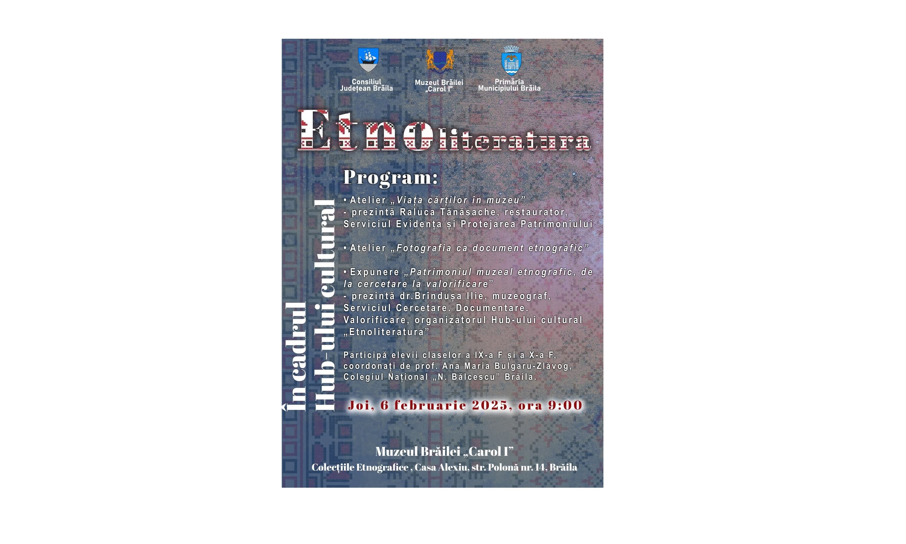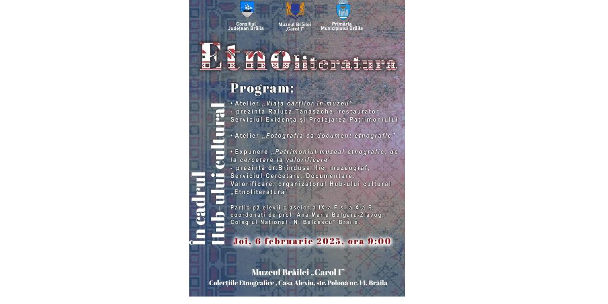 Muzeul Brăilei „Carol I” - Colecțiile Etnografice organizează joi, 6 februarie, începând cu ora 9:00, la Casa Alexiu (str. Polonă nr.14) - clădire de patrimoniu din Strada Polonă nr. 14 - o nouă întâlnire în cadrul Hub-ului cultural „Etnoliteratura”, având ca teme de discuție patrimoniul muzeal etnografic, importanța fotografiei în cercetarea etnografică și cărțile restaurate care „prind viață în muzeu”.