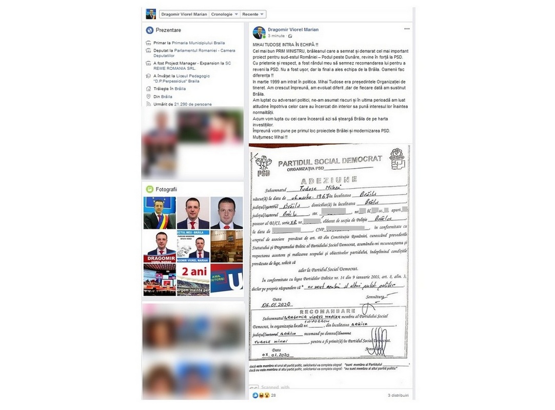 ”MIHAI TUDOSE INTRĂ ÎN ECHIPĂ !!! Cel mai bun PRIM MINISTRU, brăileanul care a semnat și demarat cel mai important proiect pentru sud-estul României - Podul peste Dunăre, revine în forță la PSD. Cu prietenie și respect, a fost rândul meu să semnez recomandarea lui pentru a reveni la PSD. Nu a fost ușor, dar la final a ales echipa de la Brăila. Oamenii fac diferența !!”, a postat Dragomir.