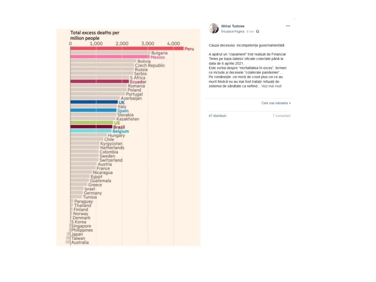”A apărut un «clasament» trist realizat de Financial Times pe baza datelor oficiale colectate până la data de 6 aprilie 2021. Este vorba despre «mortalitatea în exces», termen ce include și decesele «colaterale pandemiei»... Pe românește: cei morți de covid plus cei ce au murit fiindcă nu au mai fost tratați/ refuzați de sistemul de sănătate ca nefiind «urgențe»... România e pe locul 10. Locul 10 nu este un loc rău dacă este un clasament pozitiv, cu premii, diplome, aplauze... Dar acesta este un clasament al morții! Asta au reușit PNL-USR-PLUS, Orban, Cîțu, Cioloș, Barna și haoticii și habarniștii lor. Să ne omoare. Și să capete și «recunoaștere» internațională pe această temă... Anexez clasamentul.. poate Cîțu îl publică și el pe pagina lui în serialul lui: «#românii trebuie să știe»..... Asasini de 10? Habarniști de 10? Decideți dumneavoastră...”, a scris Tudose pe Facebook.