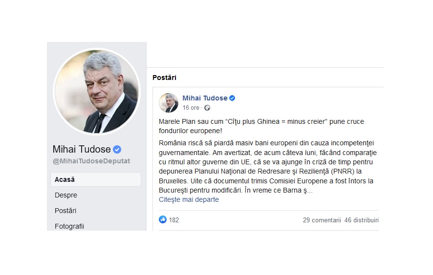 ”Iaca de ce: programarea s-a făcut de ochii lumii, fără nicio legătură cu nevoile și capacitatea noastră de implementare. PNRR conține niște povești, care nu au un final fericit: o colecție de așa-zise reforme, care nu se pliază pe nevoile prezentate. Nici vorbă de măsuri concrete, calendar de implementare! În plus, PNRR a deraiat de pe «șina» de REDRESARE, rațiunea pentru care acest mecanism a fost creat la nivelul UE. De exemplu, PNRR prevede, printre altele, finanțarea sistemului de irigații, susținerea ONG-urilor, reforma pensiilor și a companiilor de stat etc. Vedeți vreo legătură cu redresarea în contextul pandemiei? În condițiile în care sistemul sanitar este principalul afectat de pandemie și când discutăm de redresare acesta ar fi trebuit să beneficieze de cea mai mare alocare (din 30 de miliarde, sănătatea conform lui Ghinea are 4 miliarde). Și fondurile pentru agricultură au finanțat dezvoltarea sistemului de irigații, chiar în perioada 2014-2020 și este posibil și în 2021-2027. Detalii, nu? Comisia Europeană nu le consideră a fi detalii și va trozni cu subiect si predicat autoritățile române, într-un mod foarte simplu: nu vă aprobăm programele de finanțare până nu faceți lucrurile cum trebuie”, a avertizat Tudose.