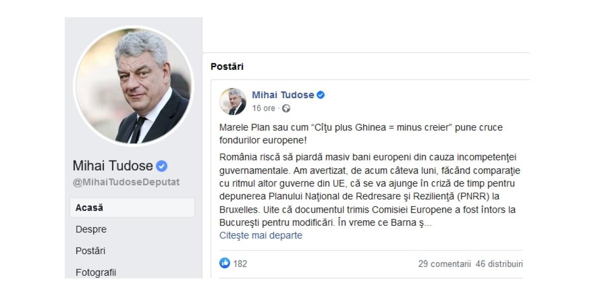 Europarlamentarul PSD Brăila, Mihai Tudose, s-a arătat îngrijorat în privința traseului Planului Național de Redresare și Reziliență (PNRR), după ce documentul a fost trimis înapoi la București de către Comisia Europeană pentru revizuire. Acesta a făcut recent un comentariu pe această temă, pe care l-a publicat pe rețelele de socializare cu titlul: ”Marele Plan sau cum «Cîţu plus Ghinea = minus creier» pune cruce fondurilor europene!”. Pe scurt, acesta a avertizat că România riscă să piardă foarte mulți bani europeni, doar pentru că ministrul Investițiilor și proiectelor europene, Cristian Ghinea, și vicepremierul Dan Barna nu și-ar fi făcut treaba corect și nu ar fi ținut cont de doleanțele Comisiei Europene la încropirea PNRR.
