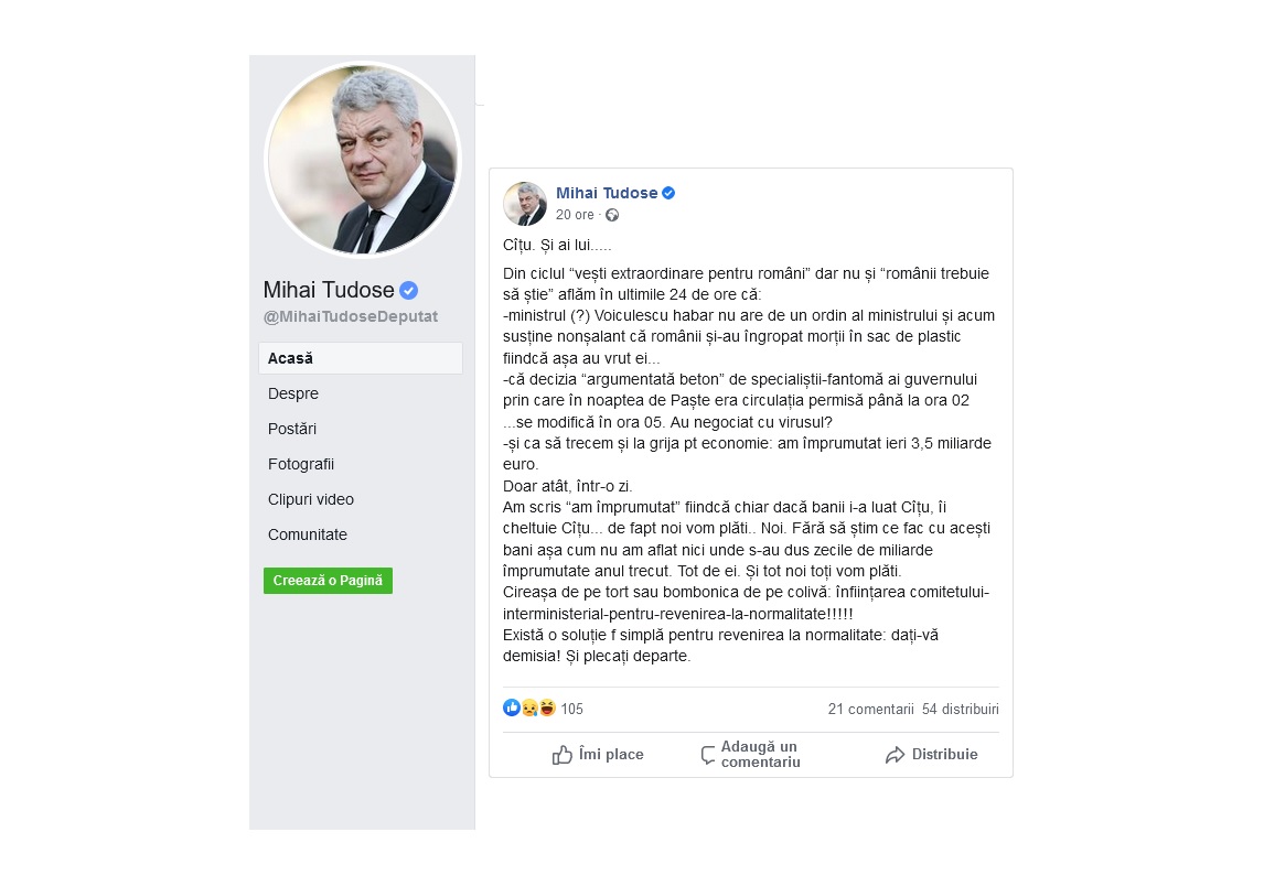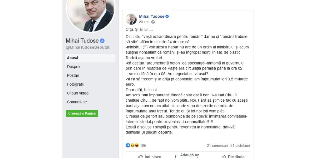 ”Din ciclul «vești extraordinare pentru români» dar nu și «românii trebuie să știe» aflăm în ultimile 24 de ore că: ministrul (?) Voiculescu habar nu are de un ordin al ministrului și acum susține nonșalant că românii și-au îngropat morții în sac de plastic fiindcă așa au vrut ei... Că decizia «argumentată beton» de specialiștii-fantomă ai guvernului prin care în noaptea de Paște era circulația permisă până la ora 02... se modifică în ora 05. Au negociat cu virusul? Și ca să trecem și la grija pentru economie: am împrumutat ieri 3,5 miliarde euro. Doar atât, într-o zi. Am scris «am împrumutat» fiindcă chiar dacă banii i-a luat Cîțu, îi cheltuie Cîțu... de fapt noi vom plăti... Noi. Fără să știm ce fac cu acești bani așa cum nu am aflat nici unde s-au dus zecile de miliarde împrumutate anul trecut. Tot de ei. Și tot noi toți vom plăti. Cireașa de pe tort sau bombonica de pe colivă: înființarea comitetului-interministerial-pentru-revenirea-la-normalitate!!!!! Există o soluție foarte simplă pentru revenirea la normalitate: dați-vă demisia! Și plecați departe”, a scris Tudose pe Facebook.
