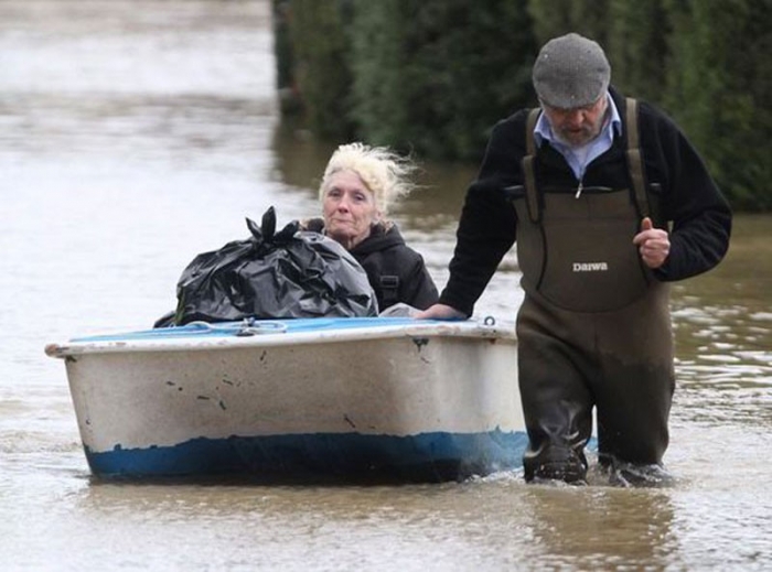 În satele din Moorland, unde digurile ridicate pentru a opri apele nu mai fac faţă, aproape 140 de locuitori au fost evacuaţi cu ajutorul maşinilor armatei britanice.