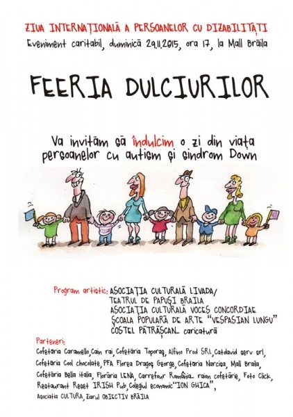 Două ONG-uri locale şi-au programat pentru acest wekend un eveniment caritabil cu ocazia Zilei Internaţionale a Persoanelor cu Dizabilităţi. Este vorba despre Asociaţiile SOS Autism şi Vlad Sergiu Botez (copii cu Sindrom Down). Astfel, duminică, 29 noiembrie, cu începere de la ora 17.00, în cadrul complexului comercial Mall Brăila, cei doi organizatori au pregătit mai multe surprize brăilenilor, printre care programe artistice susţinute de Asociaţia Culturală Livada/ Teatrul de Păpuşi Brăila, Asociaţia culturală Voces Concordiae, precum şi de Şcoala Populară de Arte "Vespasian Lungu". De asemenea, la eveniment şi-a anunţat prezenţa şi caricaturistul Costel Pătrăşcan, cel care, de altfel, a realizat şi afişul evenimentului anunţat pentru acest weekend.