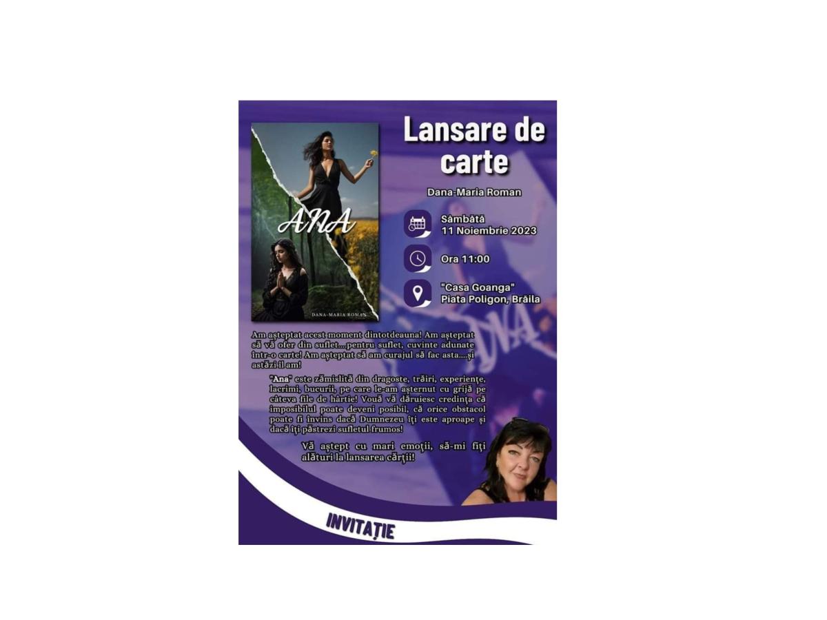 Sâmbătă, 11 noiembrie, de la ora 11.00, la Casa „Petre Ștefănescu-Goangă”, din Piața Poligon nr. 2, are loc lansarea volumului „Ana”, apărut la Editura „Napoca Star”, autor Dana Maria Roman, avocat în cadrul Baroului Brăila, bucureșteancă stabilită în orașul de la Dunăre din anul 1998.