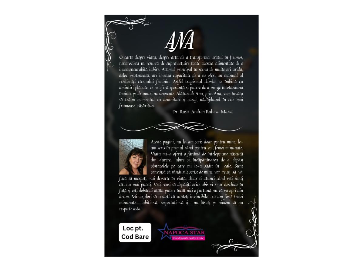Potrivit autoarei, cartea care a văzut lumina tiparului și care va ajunge sâmbătă în mâinile cititorilor este, într-un fel, o autobiografie. A fost scrisă cu sufletul și vorbește despre dragoste, trăiri, sentimente, lecții de viață, lacrimi, fericire, speranță și temeri. Potrivit Editurii „Napoca Star”, „Ana” este o carte pitorească, cu fărâme de suflet, care te îndeamnă la drumeții și reflecție.