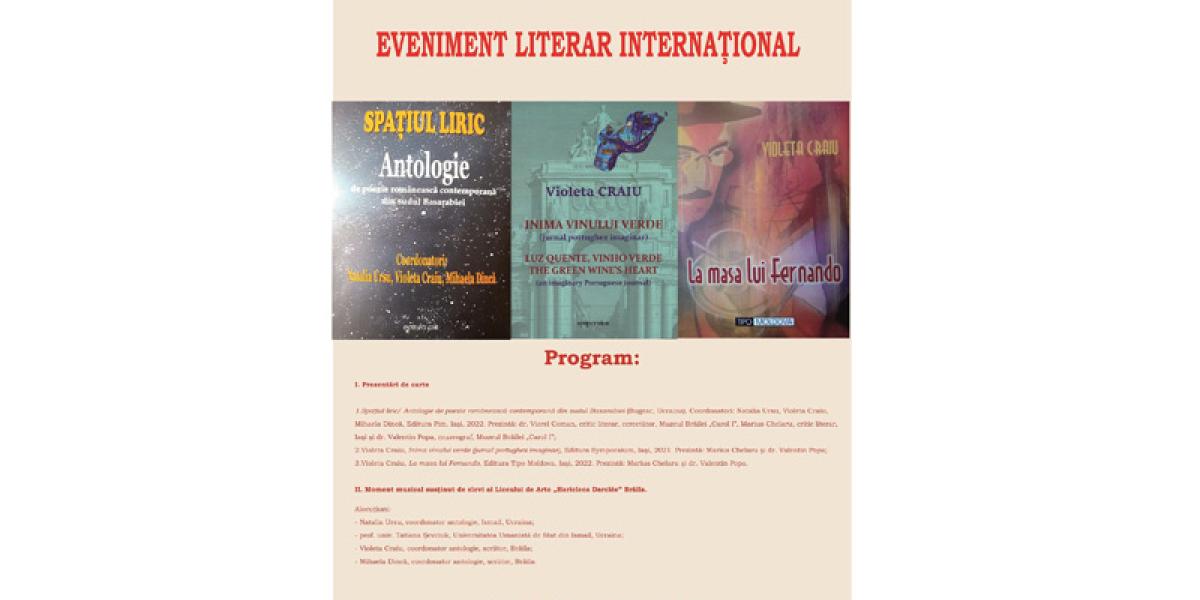 Programul zilei va cuprinde prezentarea volumului "Spațiul liric/ Antologie de poezie românească contemporană din sudul Basarabiei" (Bugeac, Ucraina), coordonatori: Natalia Ursu, Violeta Craiu și Mihaela Dincă. Cartea a văzut lumina tiparului în Editura Pim, Iași, în anul 2022. Prezintă: dr. Viorel Coman, critic literar, cercetător la Muzeul Brăilei "Carol I", Marius Chelaru, critic literar, Iași și dr. Valentin Popa, muzeograf la Muzeul Brăilei "Carol I".