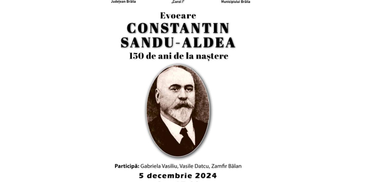 Muzeul Brăilei „Carol I” organizează joi, 5 decembrie, la Casa Memorială „Panait Istrati”, din Grădina Publică, începând cu ora 17:00, evocarea „Constantin Sandu Aldea - 150 de ani de la naștere”. La eveniment participă prof. Gabriela Vasiliu, Vasile Datcu, dr. Zamfir Bălan (Muzeul Brăilei „Carol I”), care vor rosti alocuțiuni despre viața, opera și personalitatea marelui scriitor sămănătorist brăilean, născut la Tichilești, în urmă cu un secol și jumătate.