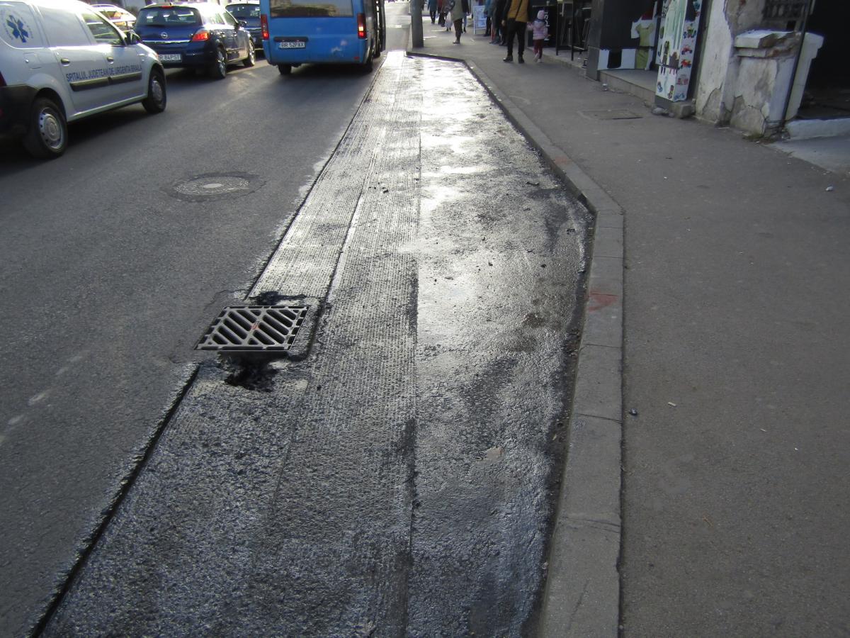 Ieri, după ce asfaltul turnat luni s-a uscat, responsabili din cadrul Primăriei au vrut să verifice dacă apa mai băltește în stație. Astfel, a fost golită o cisternă de apă pe zona cu probleme și... ghinion, tot a rămas apă pe carosabil și trotuar, deși s-a turnat asfalt până la doi centimetri de nivelul trotuarului! Va urma, probabil, o nouă tentativă - a treia sau a patra, că deja li se pierde șirul - de rezolvare a problemei. Iar cel mai probabil se va ajunge la varianta reprofilării carosabilului, cu un bombament și pantă corespunzătoare, așa încât apa să fie preluată rapid printr-o rigolă cu grătar metalic montată pe segmentul dintre străzile Griviței și Mihai Bravu.